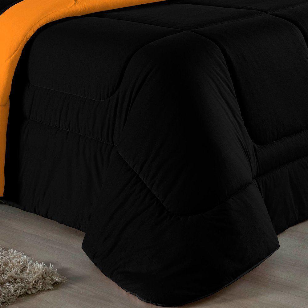 Kit Edredom Dupla Face + Jogo De Lençol Casal Nobre 7 Peças Malha 100% Algodão - Preto / Laranja