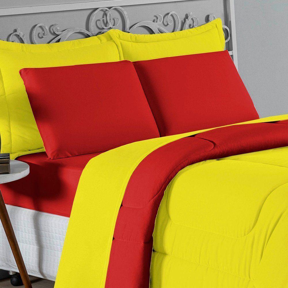 Kit Edredom Dupla Face + Jogo De Lençol Casal Viúva Nobre 7 Peças Malha 100% Algodão - Amarelo / Vermelho