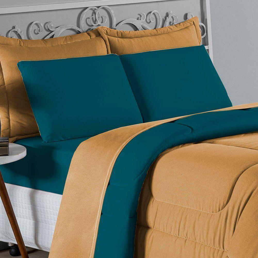 Kit Edredom Dupla Face + Jogo De Lençol Casal Viúva Nobre 7 Peças Malha 100% Algodão - Cobre / Petróleo