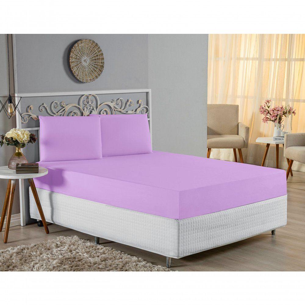 Jogo De Cama Casal Nobre 3 Peças Lençol Com Elástico De 30cm De Altura Malha 100% Algodão - Lilás