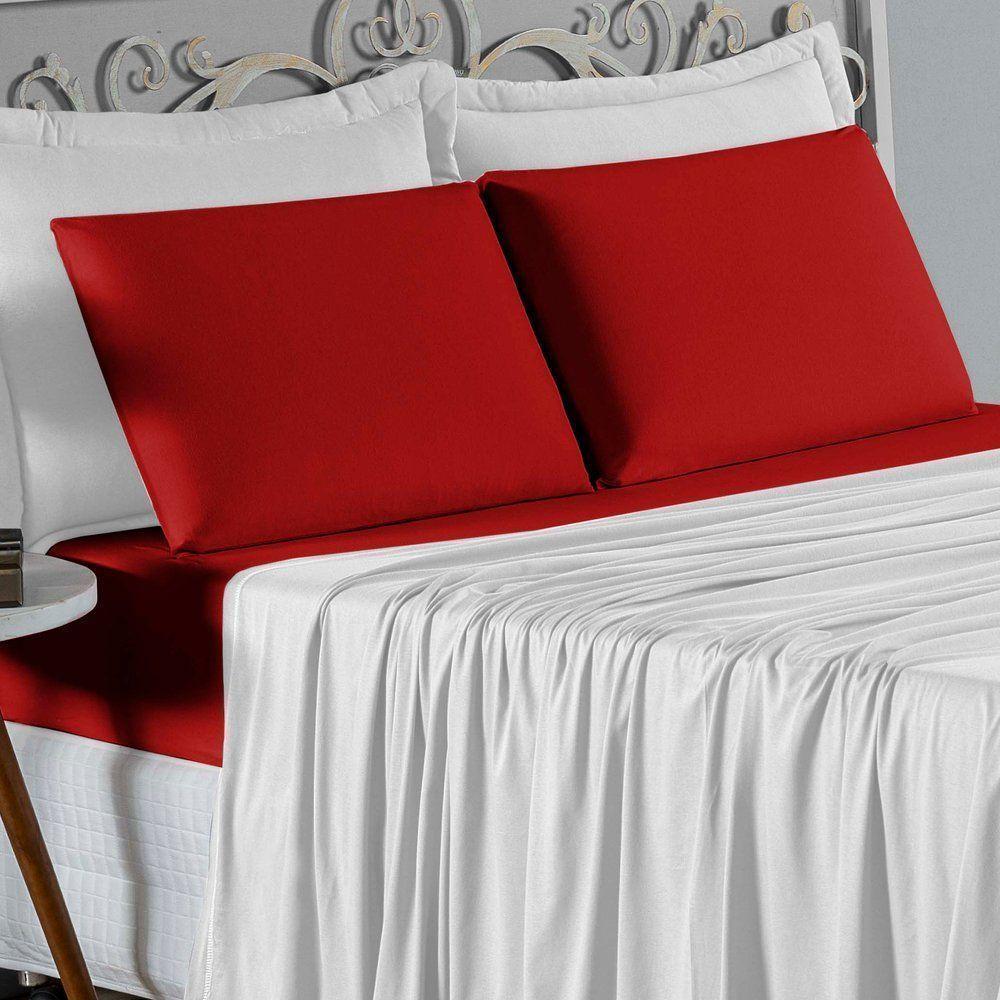 Jogo De Cama Casal Nobre 4 Peças Lençol Com Elástico De 30cm De Altura Malha 100% Algodão - Branco / Vermelho