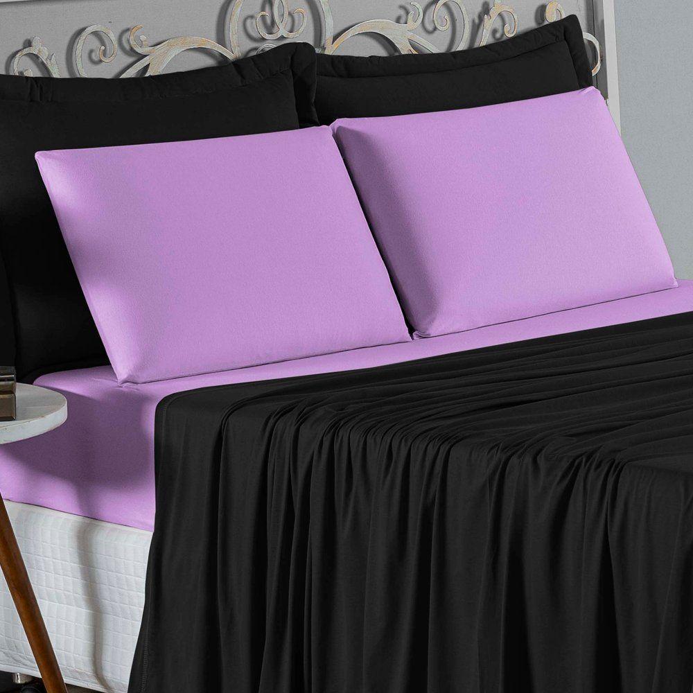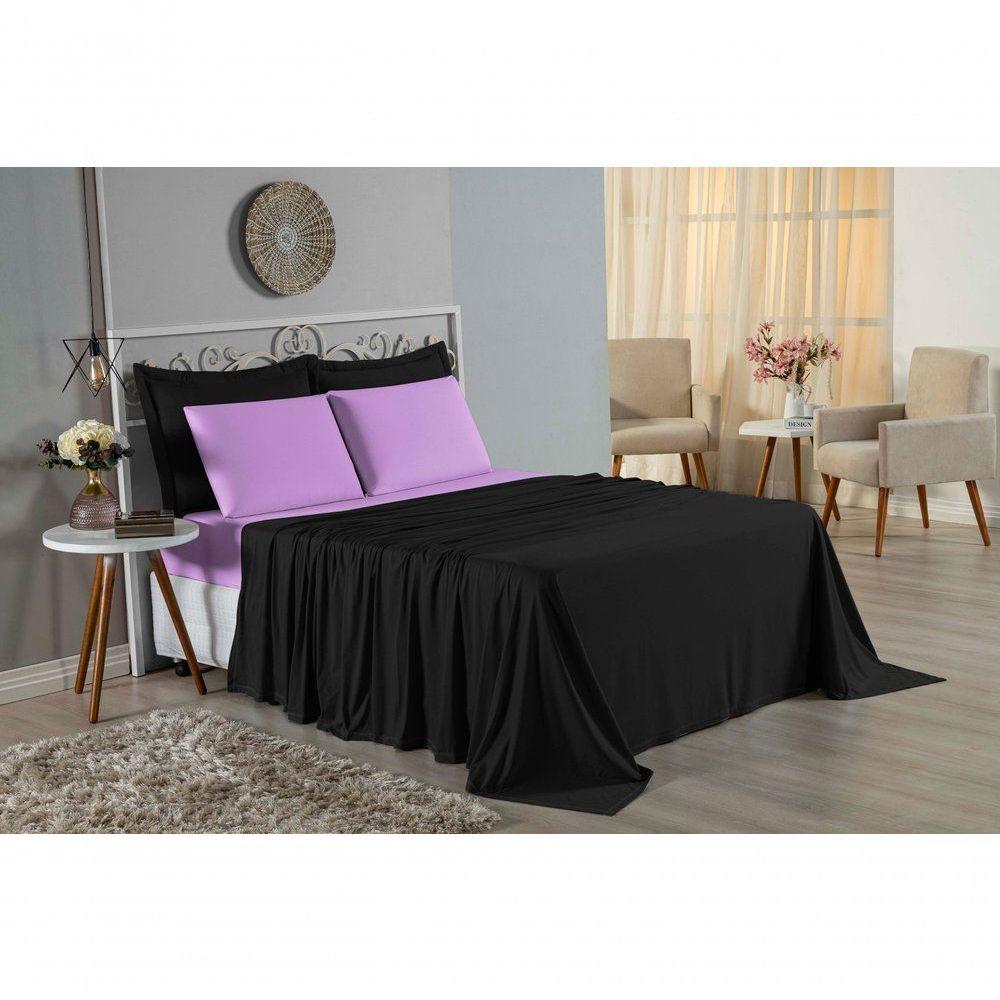 Jogo De Cama Casal Nobre 4 Peças Lençol Com Elástico De 30cm De Altura Malha 100% Algodão - Preto / Lilás