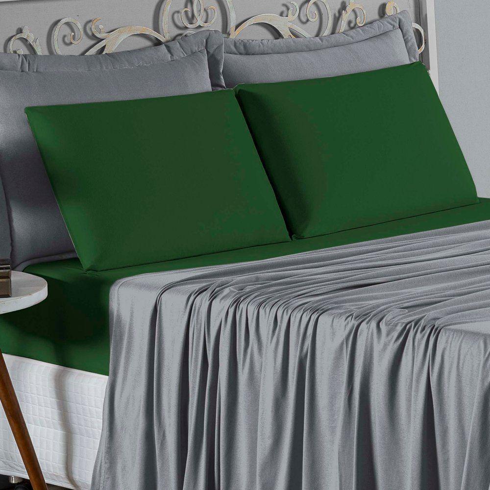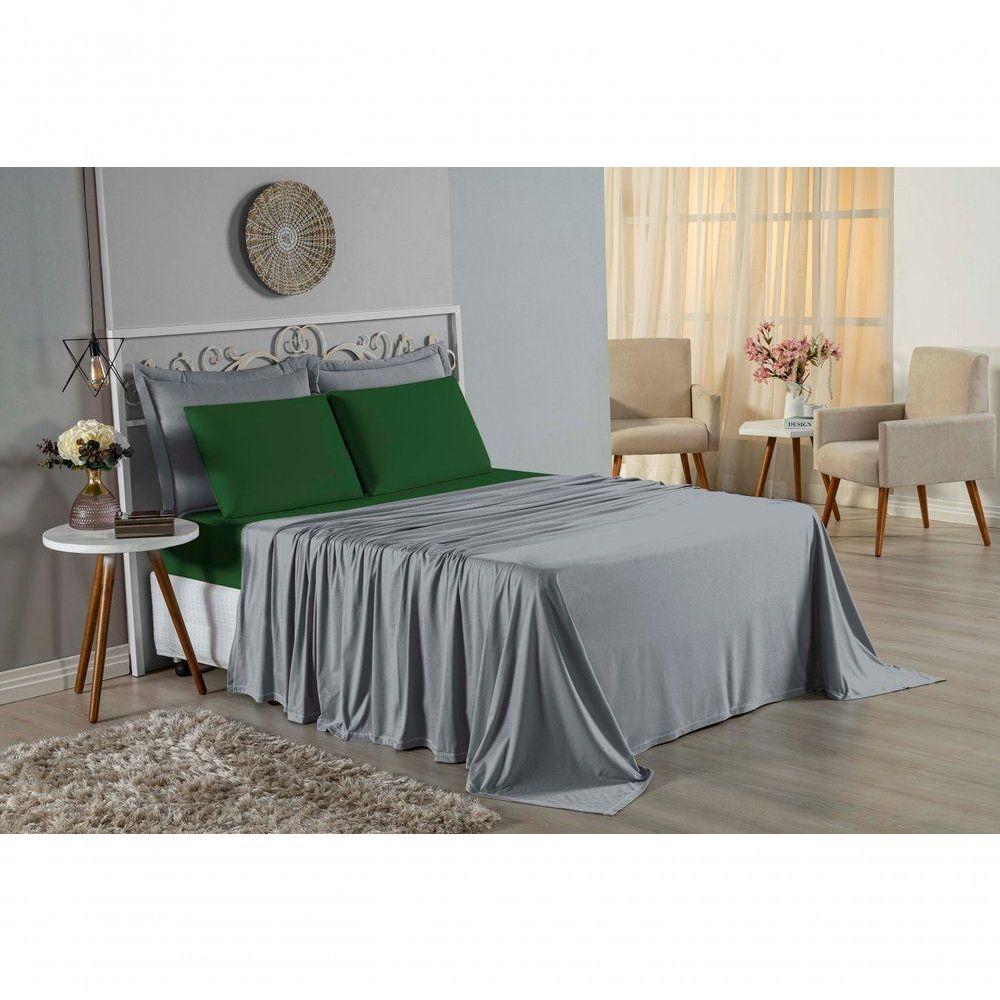 Jogo De Cama Casal Viúva Nobre 4 Peças Malha 100% Algodão - Cinza / Verde-bandeira