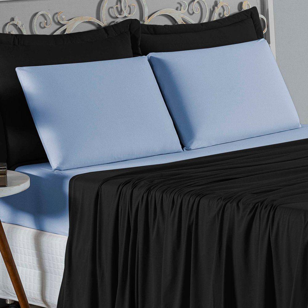 Jogo De Cama Casal Viúva Nobre 4 Peças Malha 100% Algodão - Preto / Azul-bebê