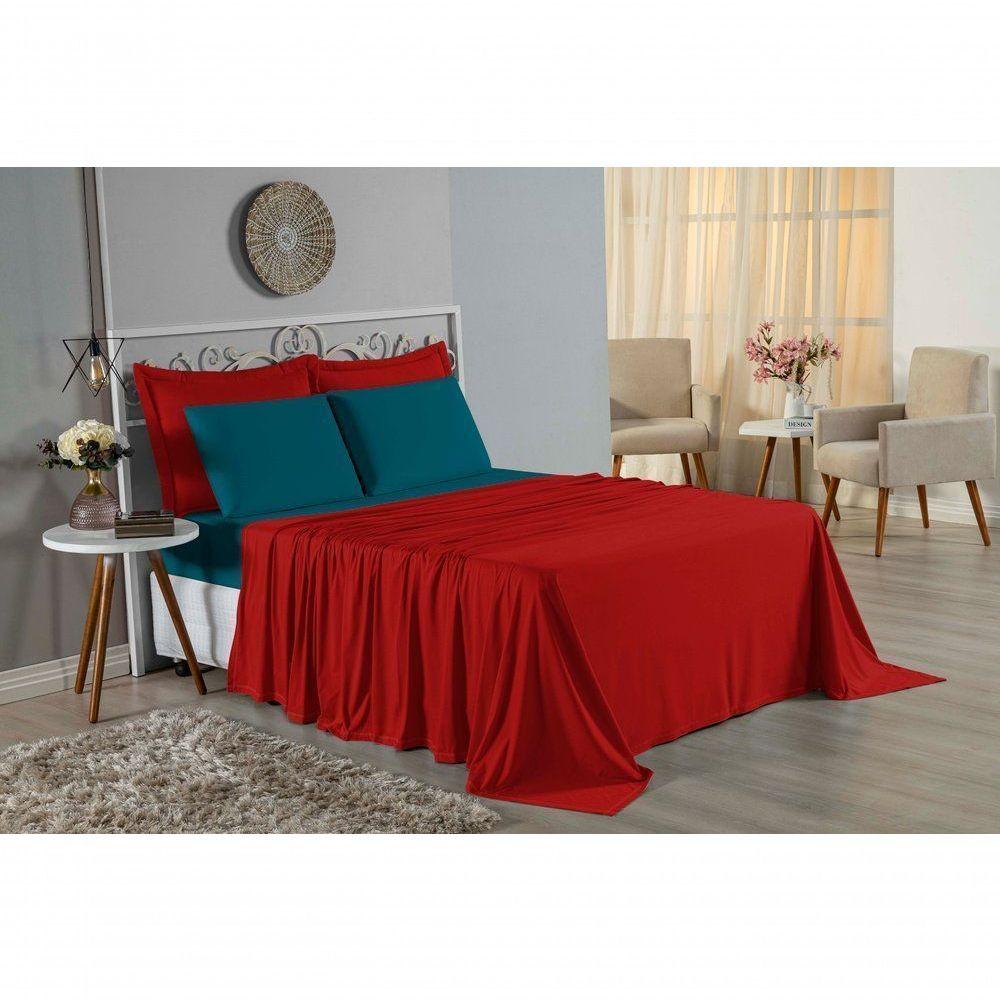 Jogo De Cama Casal Viúva Nobre 4 Peças Malha 100% Algodão - Vermelho / Petróleo