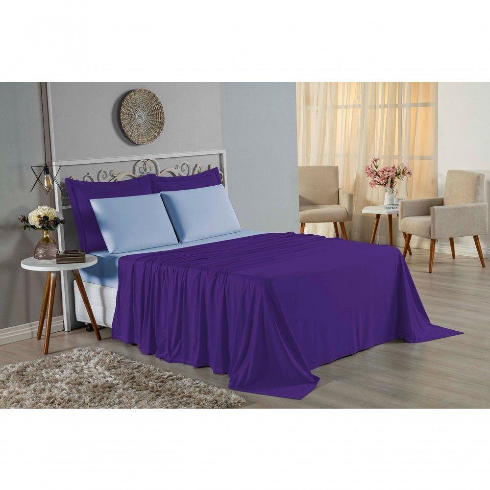 Jogo De Cama King Nobre 4 Peças Lençol Com Elástico De 30cm De Altura Malha 100% Algodão - Roxo / Azul-bebê