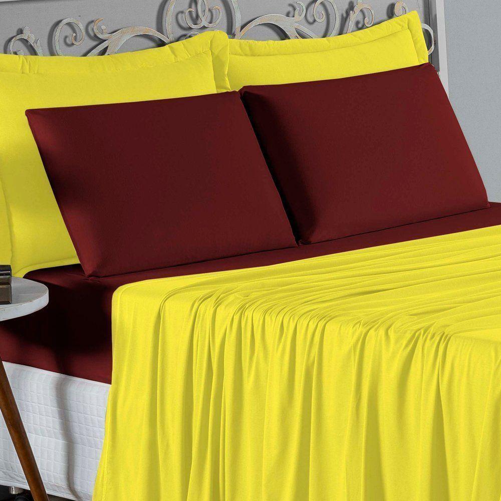 Jogo De Cama Casal Viúva Nobre 4 Peças Malha 100% Algodão - Amarelo / Vinho