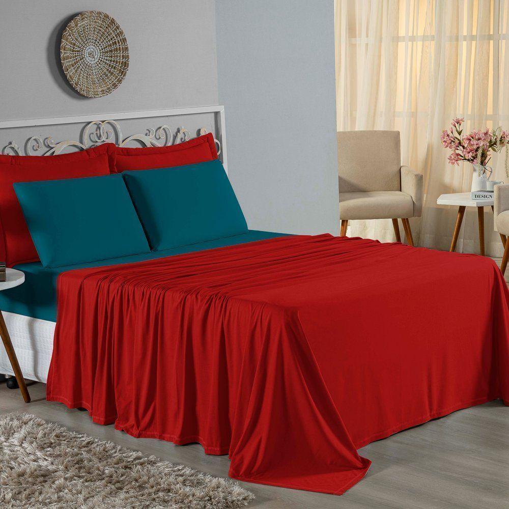 Jogo De Cama Casal Nobre 4 Peças Lençol Com Elástico De 30cm De Altura Malha 100% Algodão - Vermelho / Petróleo