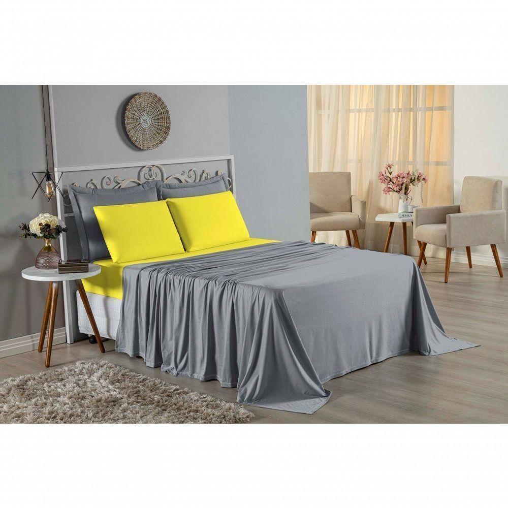Jogo De Cama Casal Viúva Nobre 4 Peças Malha 100% Algodão - Cinza / Amarelo