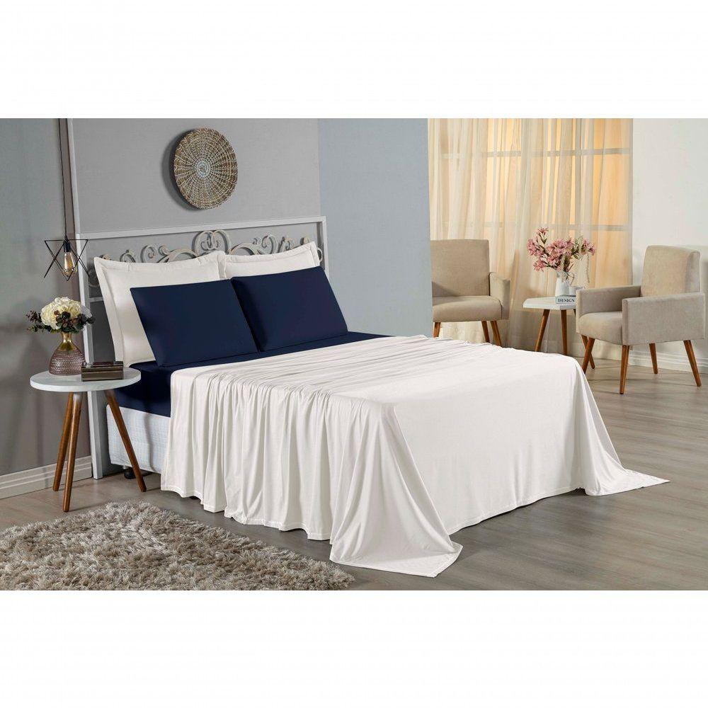 Jogo De Cama Casal Viúva Nobre 4 Peças Malha 100% Algodão - Palha / Azul-marinho
