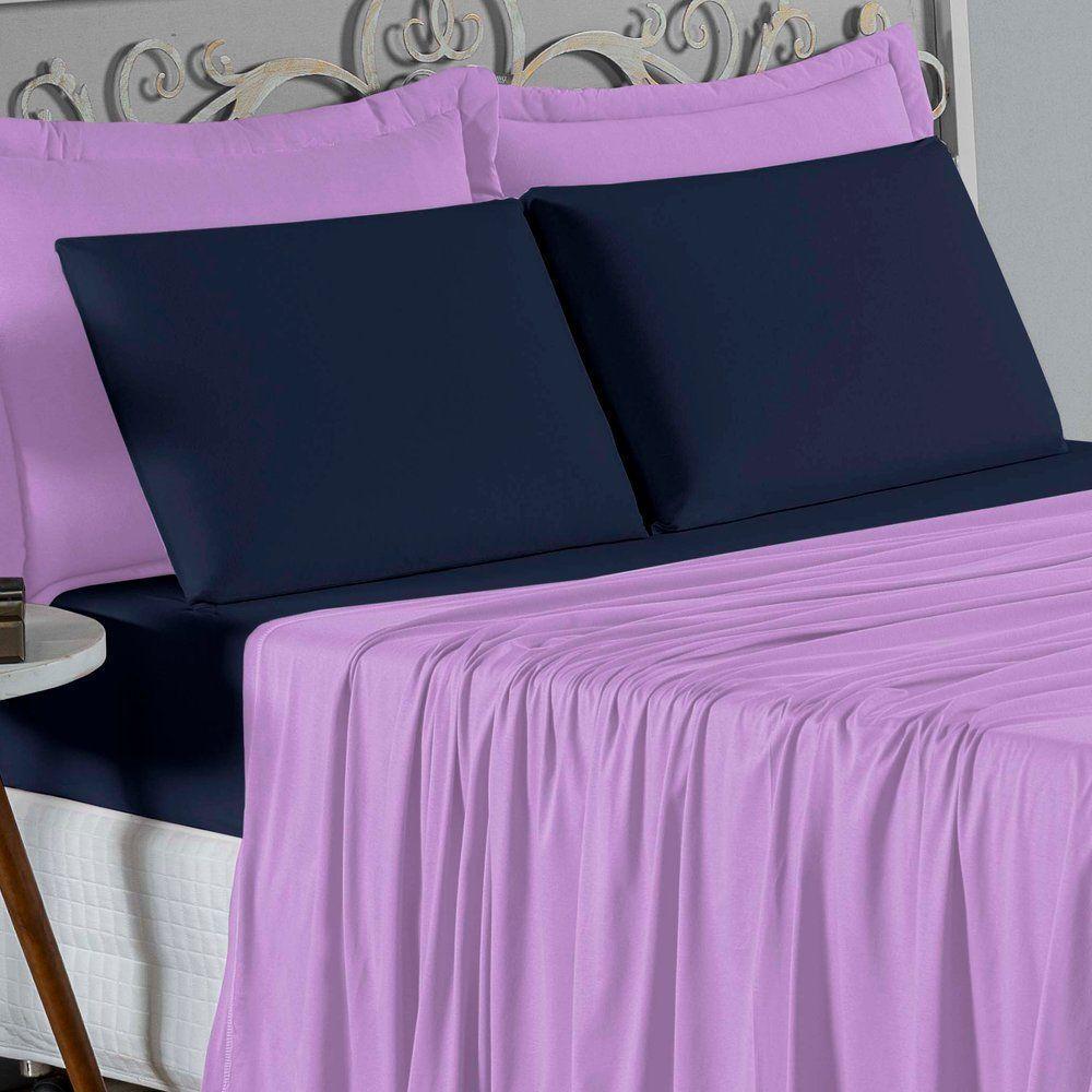 Jogo De Cama King Nobre 4 Peças Lençol Com Elástico De 30cm De Altura Malha 100% Algodão - Lilás / Azul-marinho