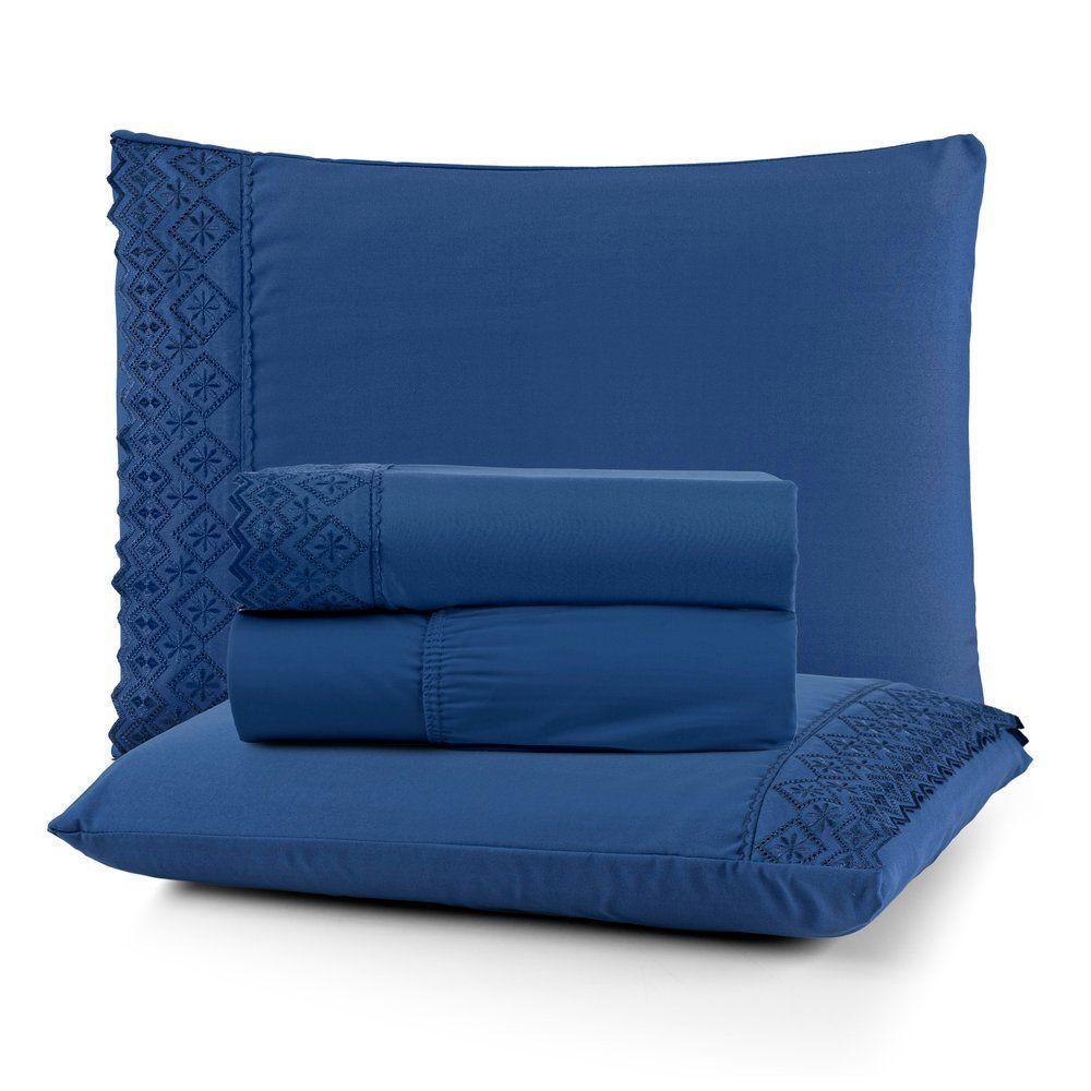 Jogo De Cama Nobless Casal Padrão 04 Peças 100% Poliéster - Azul GalaxiaConheça o Jogo de Cama Nobless e deixe seu quarto mais aconchegante, produto com toque macio e conta com detalhe em bordado inglês que é um charme a parte!Produto De Excelente Qualidade.Produto composto por:01 Lençol de Cima 2,50m x 2,25m01 Lençol de Baixo c/ elástico na volta toda p/ colchão de 1,88m x 1,38cm x 30cm alt.02 Fronhas 70cm x 50cmTecido: Micropercal 200 fios com detalhe em bordado inglês nas fronhas e no lençol de cimaComposição: Tecido superior e inferior: 100% Poliéster