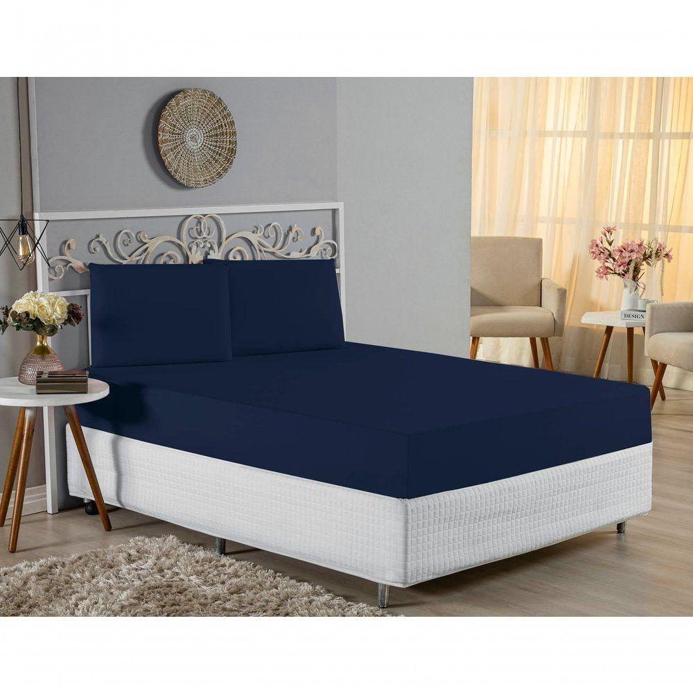 Jogo De Cama Queen Nobre 3 Peças Lençol Com Elástico De 30cm De Altura Malha 100% Algodão - Azul-marinho