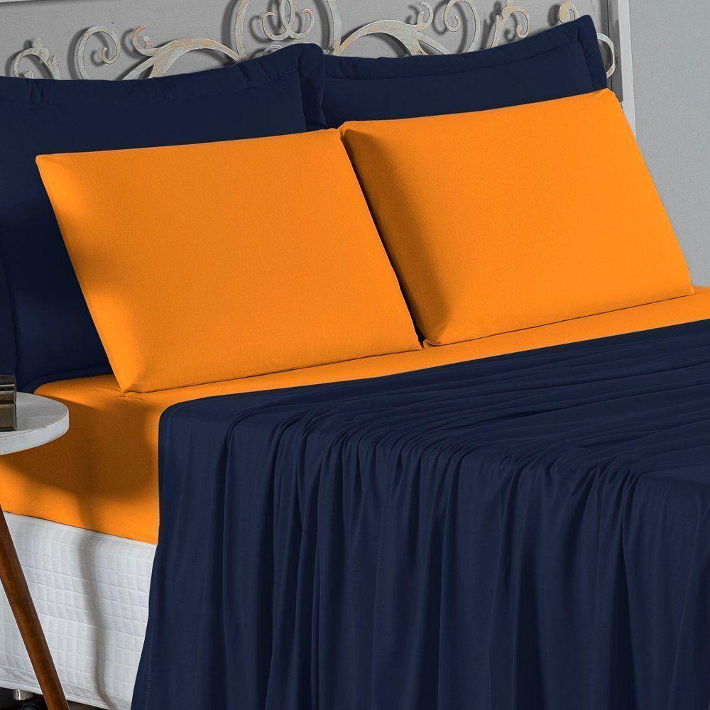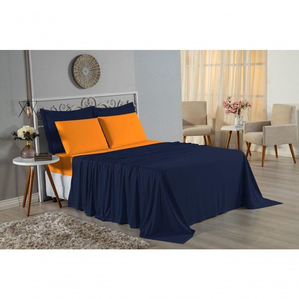 Jogo De Cama Queen Nobre 4 Peças Lençol Com Elástico De 30cm De Altura Malha 100% Algodão - Azul-marinho / Laranja