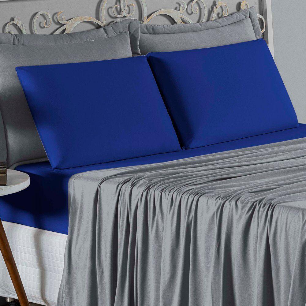 Jogo De Cama Queen Nobre 4 Peças Lençol Com Elástico De 30cm De Altura Malha 100% Algodão - Cinza / Royal