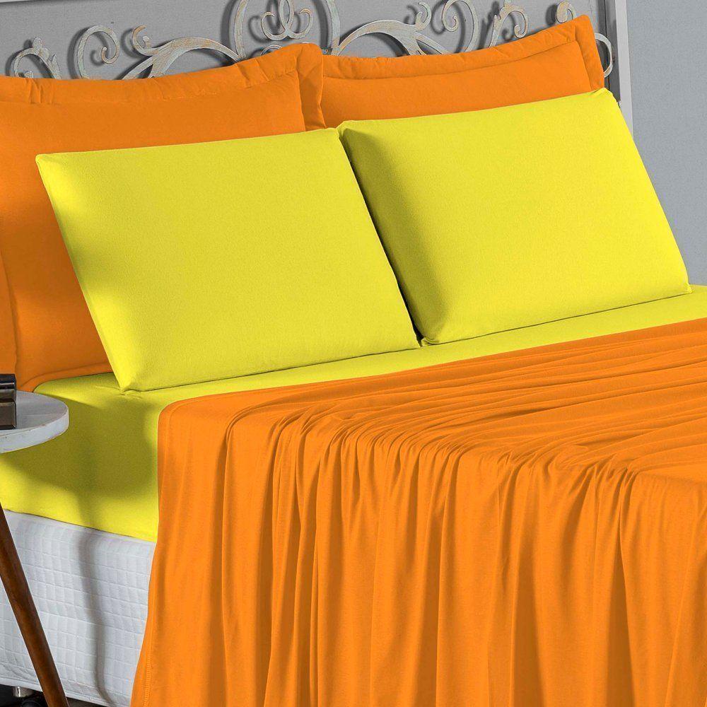 Jogo De Cama Queen Nobre 4 Peças Lençol Com Elástico De 30cm De Altura Malha 100% Algodão - Laranja / Amarelo
