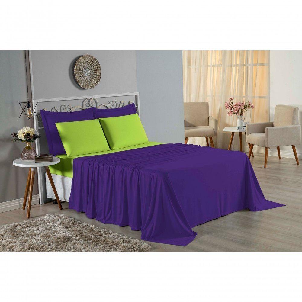 Jogo De Cama Queen Nobre 4 Peças Lençol Com Elástico De 30cm De Altura Malha 100% Algodão - Roxo / Pistache