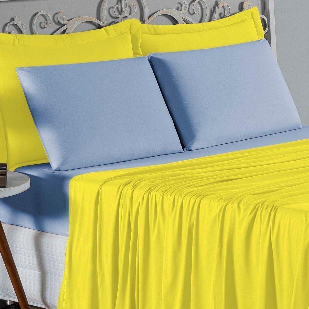 Jogo De Cama Queen Nobre 4 Peças Lençol Com Elástico De 30cm De Altura Malha 100% Algodão - Amarelo / Azul-bebê