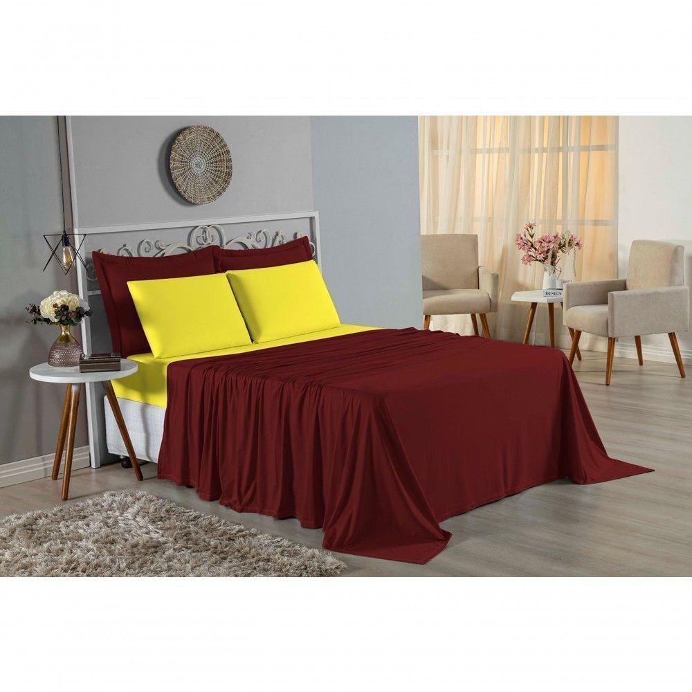 Jogo De Cama Queen Nobre 4 Peças Lençol Com Elástico De 30cm De Altura Malha 100% Algodão - Vinho / Amarelo