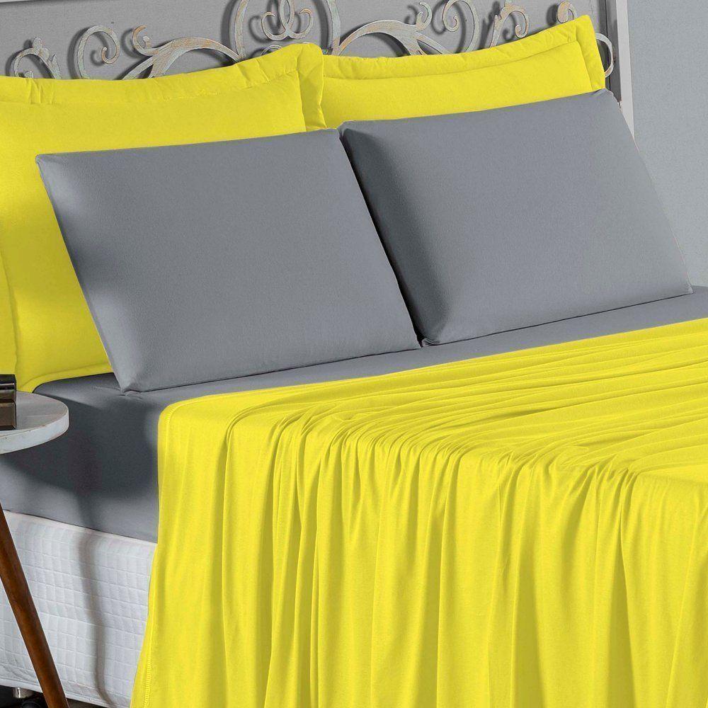 Jogo De Cama Solteiro Nobre 3 Peças Lençol Com Elástico De 30cm De Altura Malha 100% Algodão - Amarelo / Cinza