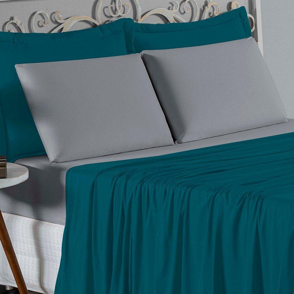 Jogo De Cama Solteiro Nobre 3 Peças Lençol Com Elástico De 30cm De Altura Malha 100% Algodão - Petróleo / Cinza