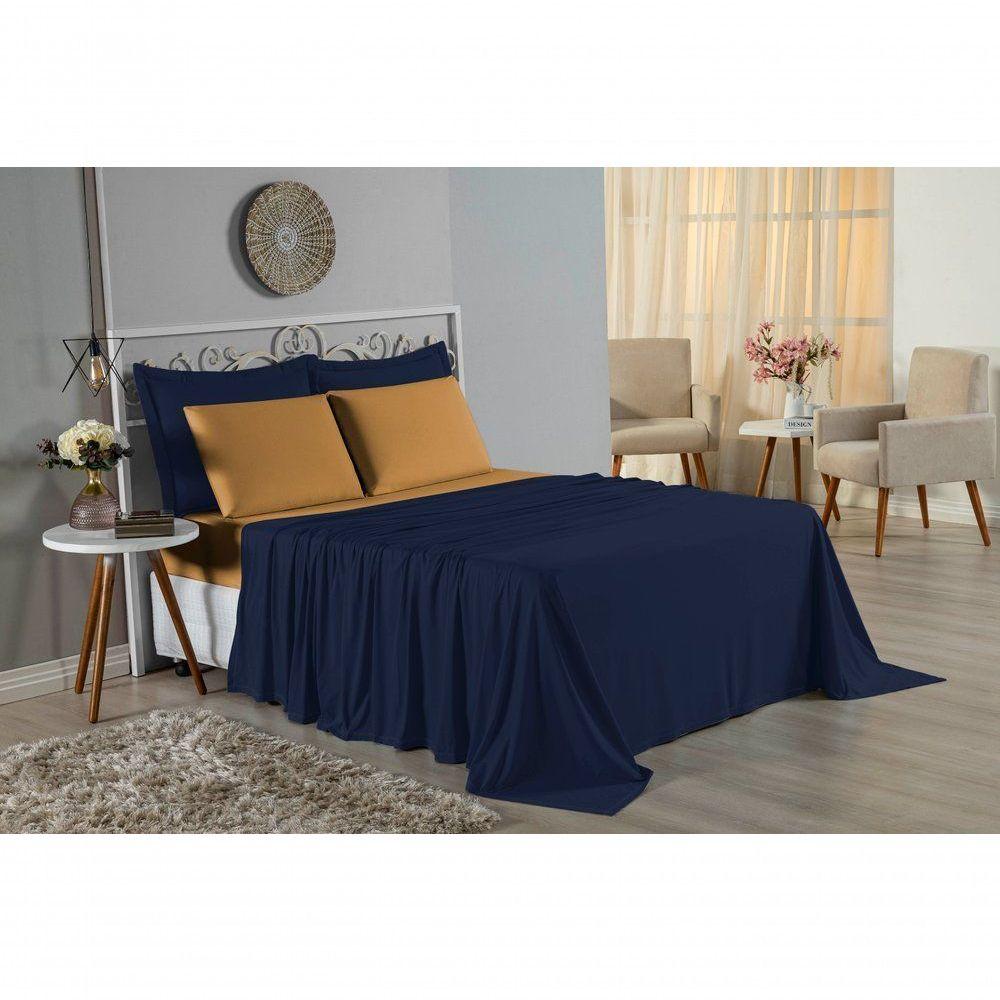 Jogo De Cama Solteiro Nobre 3 Peças Lençol Com Elástico De 30cm De Altura Malha 100% Algodão - Azul-marinho / Cobre