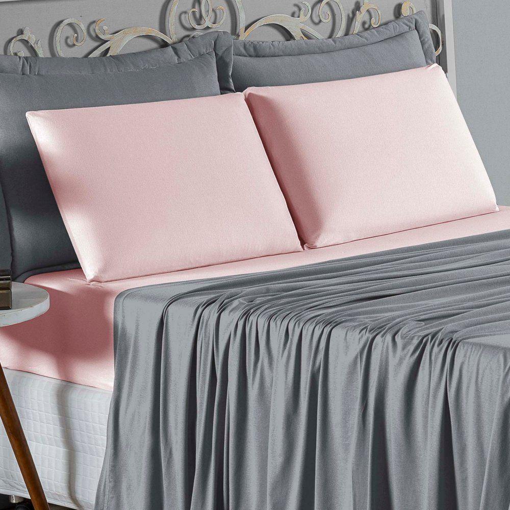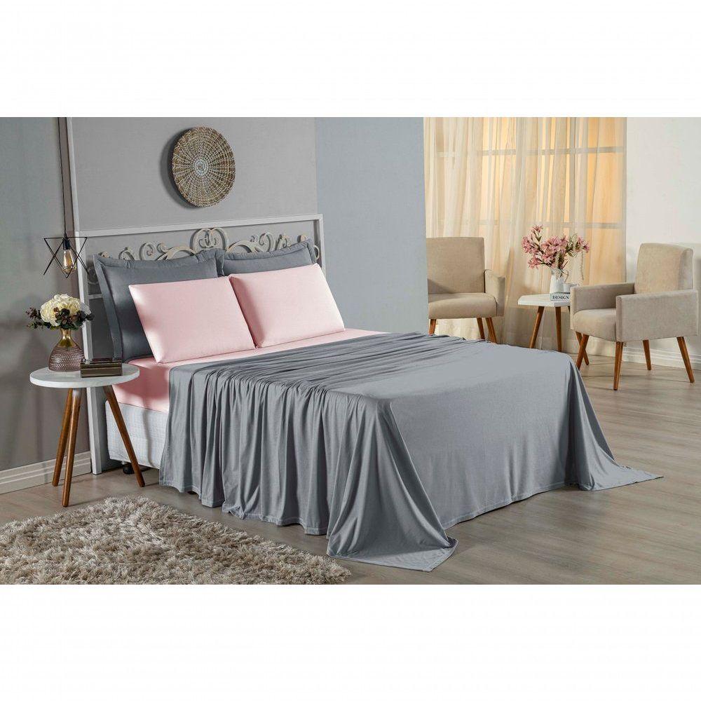 Jogo De Cama Solteiro Nobre 3 Peças Lençol Com Elástico De 30cm De Altura Malha 100% Algodão - Cinza / Rosa