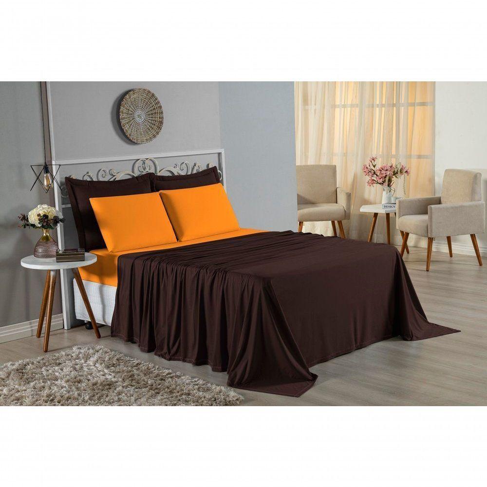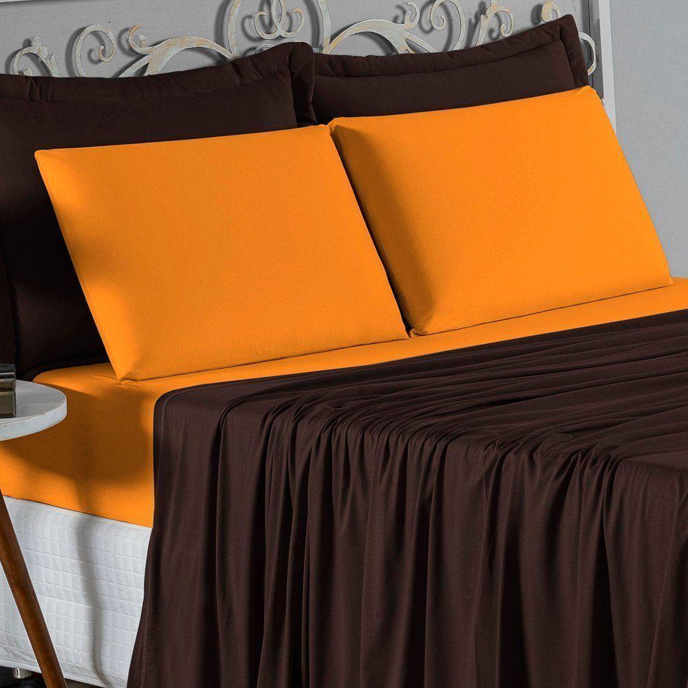 Jogo De Cama Solteiro Nobre 3 Peças Lençol Com Elástico De 30cm De Altura Malha 100% Algodão - Marrom / Laranja