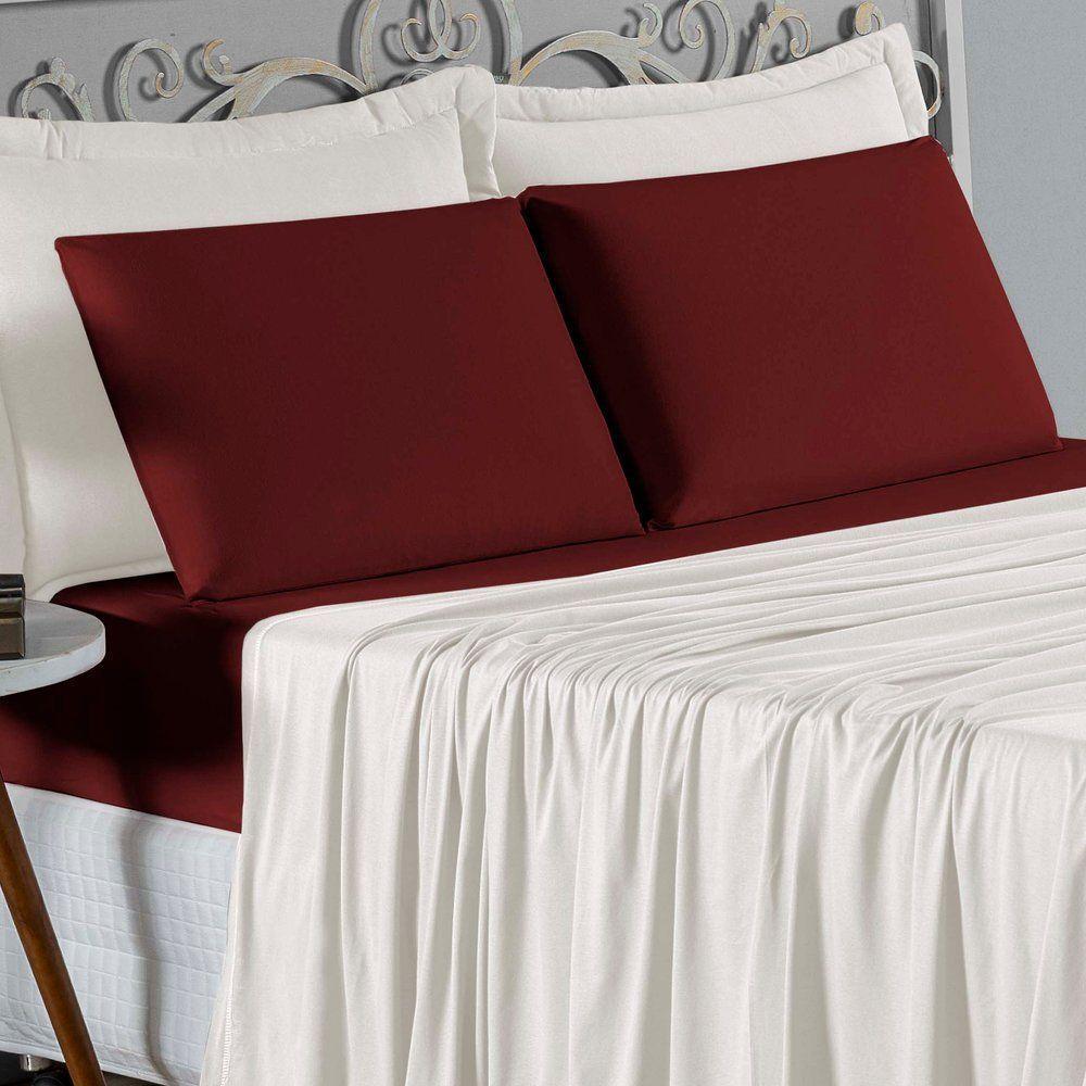 Jogo De Cama Solteiro Nobre 3 Peças Lençol Com Elástico De 30cm De Altura Malha 100% Algodão - Palha / Vinho