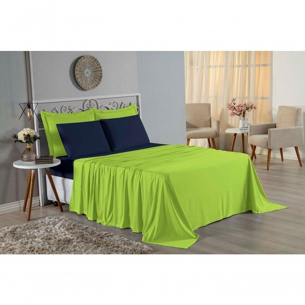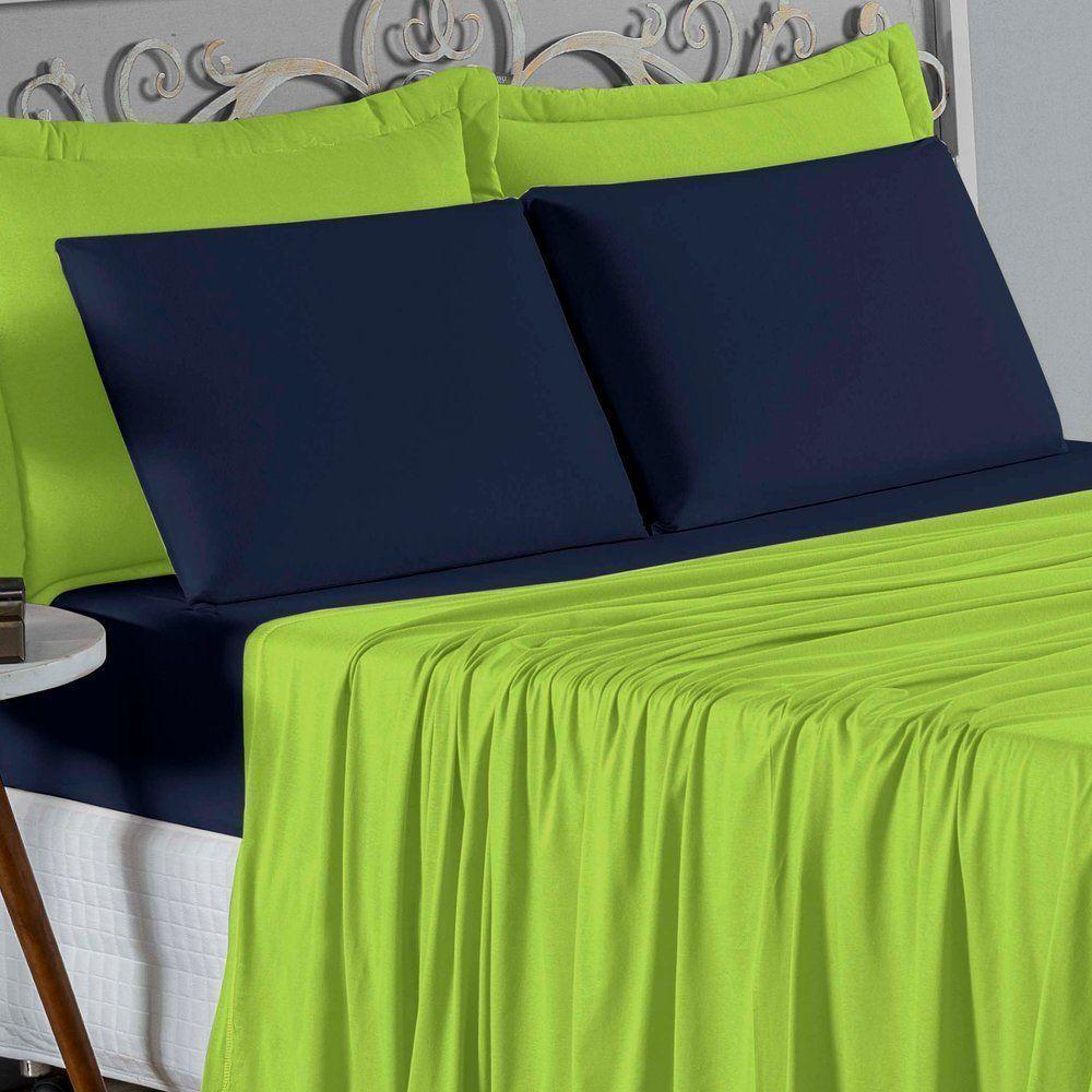 Jogo De Cama Solteiro Nobre 3 Peças Lençol Com Elástico De 30cm De Altura Malha 100% Algodão - Pistache / Azul-marinho