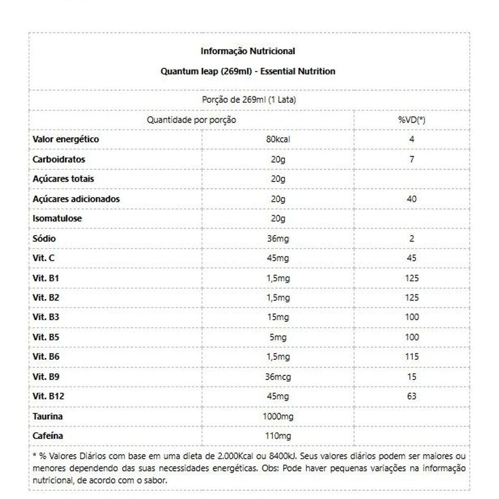 Quantum Leap Ginger Lemon (269ml) - Padrão: únicoQuantum Leap Ginger Lemon (269ml) - Essential Nutrititon Experimente algo totalmente ! Quantum Leap é uma bebida refrescante e levemente gaseificada diferente de tudo que você já provou, elaborada com ingredientes naturais altamente eficientes que promovem foco, concentração e recuperação muscular. Quantum Leap é uma alternativa aos refrigerantes ou bebidas energéticas cheias de açúcar e estimulantes artificiais. Na física quântica, quando uma partícula recebe uma quantidade extrema de energia, ela salta para um nível superior. Esse salto é chamado de Quantum Leap! CONHEÇA POR DENTRO DO QUANTUM LEAP!* Combinação única de Ingredientes: guaraná, chá verde, gengibre orgânico e gengibre tailandês, L-Taurina, Palatinose e D-Ribose;* Blend de vitaminas;* Fonte de fitonutrientes (polifenóis, catequinas, cafeína natural, gingeróis, metilxantinas);* Ingredientes com certificação NON-GMO, Kosher e Halal;* Vegano;* Sem glúten;* Sem lactose;* Sem conservantes;