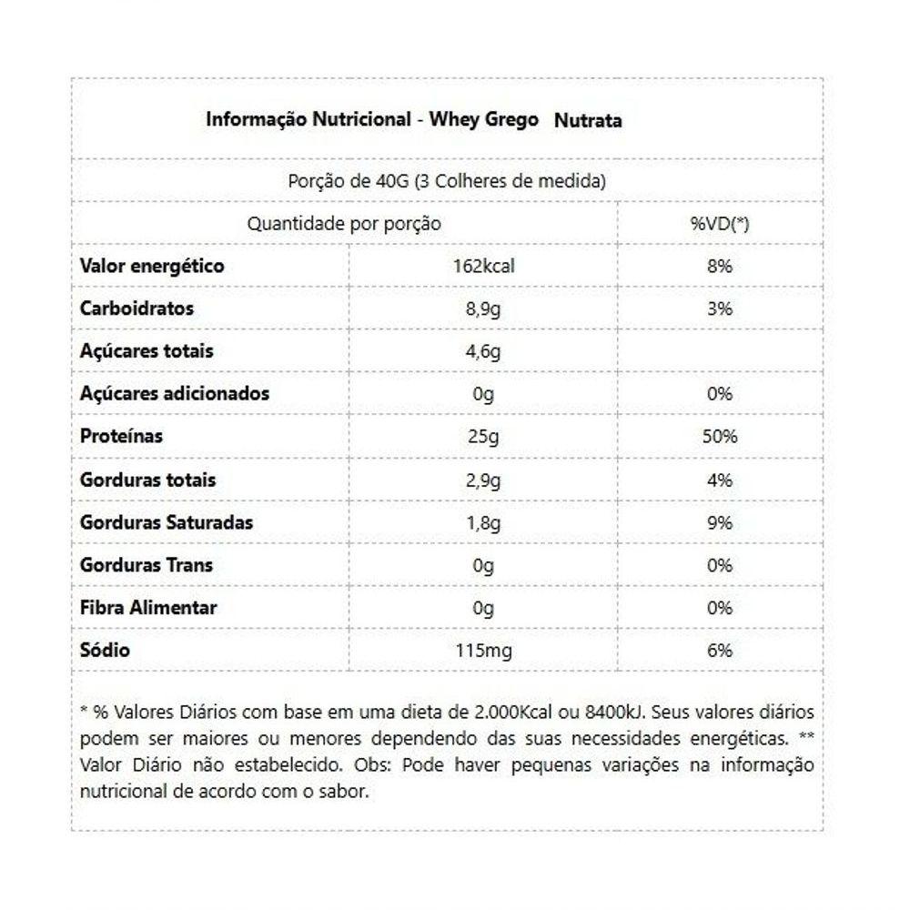 Whey Grego Refil (900g) - Sabor: BeijinhoWhey Grego Refil (900g) A combinação desses dois tipos de filtração e a adição do famoso yogurte grego, conferem ao Whey Grego da Nutrata uma cremosidade e sabor incomparável, além de um excelente aporte proteico e baixa quantidade de carboidratos e gorduras.Whey Protein Hidrolisada: O processo de hidrólise consiste em quebrar proteínas em tamanhos menores, para facilitar sua absorção e digestão. Contém entre 90% a 98% de proteínas de alta qualidade, e menor possibilidade de reações alérgicas do que a versão não hidrolisada. Tornando-se uma ótima opção para dietas restritas e construção muscular. Whey Protein Concentrado: É obtido através de um processo de separação física (filtração), onde o produto acabado contém cerca de 80% de proteína mantendo sua estrutura intacta. Em virtude do seu elevado valor nutritivo e por não sofrerem alterações de ácidos no ambiente estomacal, no intestino delgado, são rapidamente digeridas e altamente absorvidos. - Agora o Whey Grego – Nutrata – conta com Whey Protein Isolado, onde é conservada a pureza da proteína do leite. Sua grande diferença é justamente a concentração de proteínas. O suplemento consegue oferecer teores de proteína entre 92% e 98%, com baixíssimas concentrações de lactose, gordura e pouco carboidrato. BENEFÍCIOS:* Contribui para o aumento da saciedade;* Favorece a síntese proteica;* Estimula a recuperação e construção muscular;* Aporte regulador da função imunológica;* Auxílio no pós-operatório bariátrico e em dietas de emagrecimento;* Aumento de Massa muscular magra.