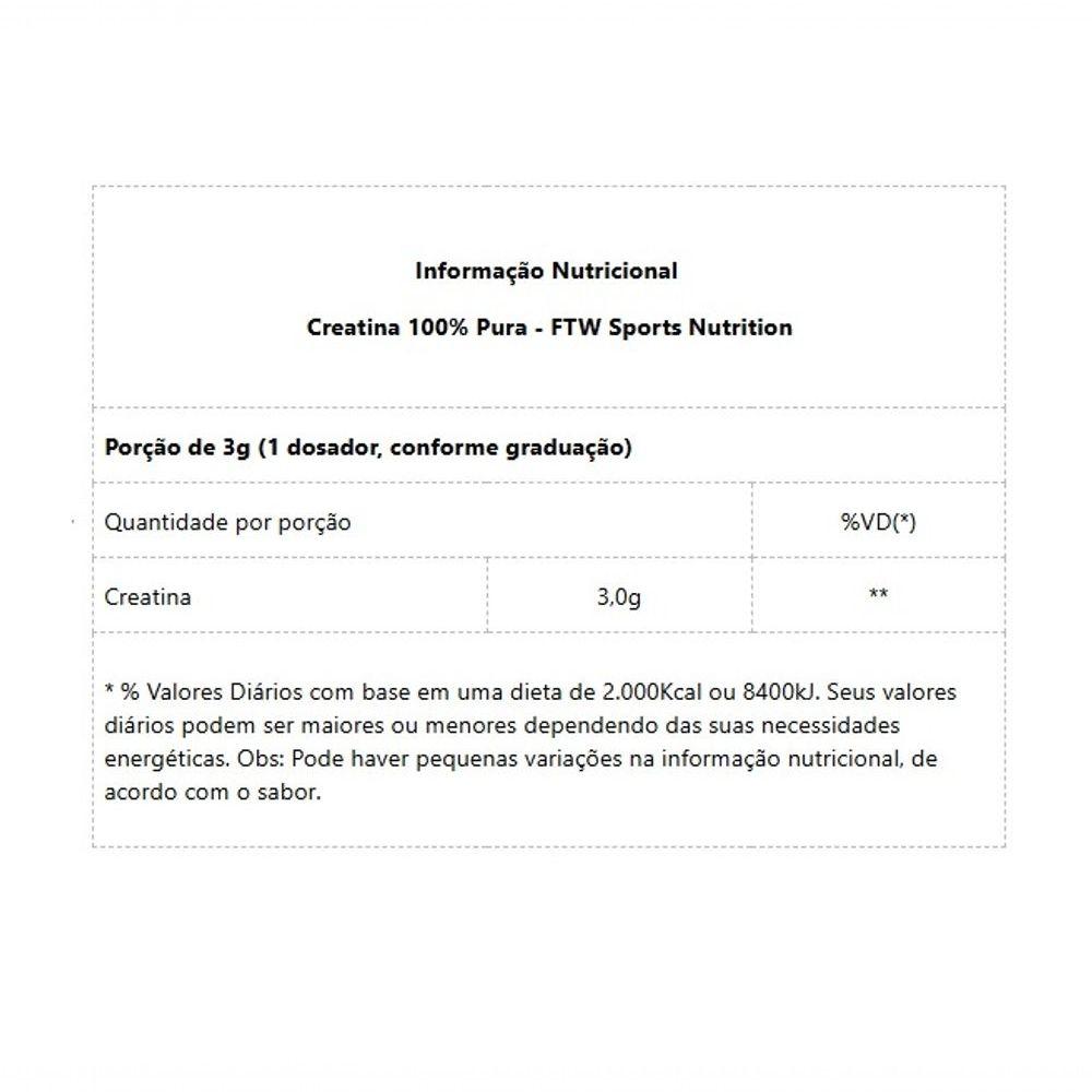 Creatina Monohidratada Micronizada 300gCreatina Monohidratada (300g) A Creatina FTW é um suplemento alimentar composto por creatina monohidratada. A creatina auxilia no aumento do desempenho físico durante exercícios repetidos de curta duração e alta intensidade. Adquirir Creatina FTW é ter garantia de que está usando um produto de qualidade, que atende as necessidades de que pratica atividades físicas. A creatina tem como função ajudar a melhorar a performance corporal durante exercícios repetitivos de curta duração e alta intensidade, contribui para o ganho de força e auxilia na melhora dos resultados. Benefícios:- Creatina 100% Pura;- Ganho de força;- Melhora o desempenho;- Para treinos de alta intensidade.Informação Nutricional Creatina 100% Pura - FTW Sports NutritionPorção de 3g (1 dosador, conforme rgaduação)Quantidade por porção%VD(*)Creatina3,0g*** % Valores Diários com base em uma dieta de 2.000Kcal ou 8400kJ. Seus valores diários podem ser maiores ou menores dependendo das suas necessidades energéticas. Obs: Pode haver pequenas variações na informação nutricional, de acordo com o sabor.
