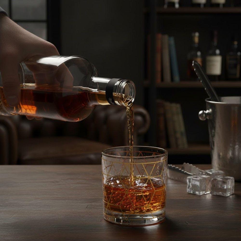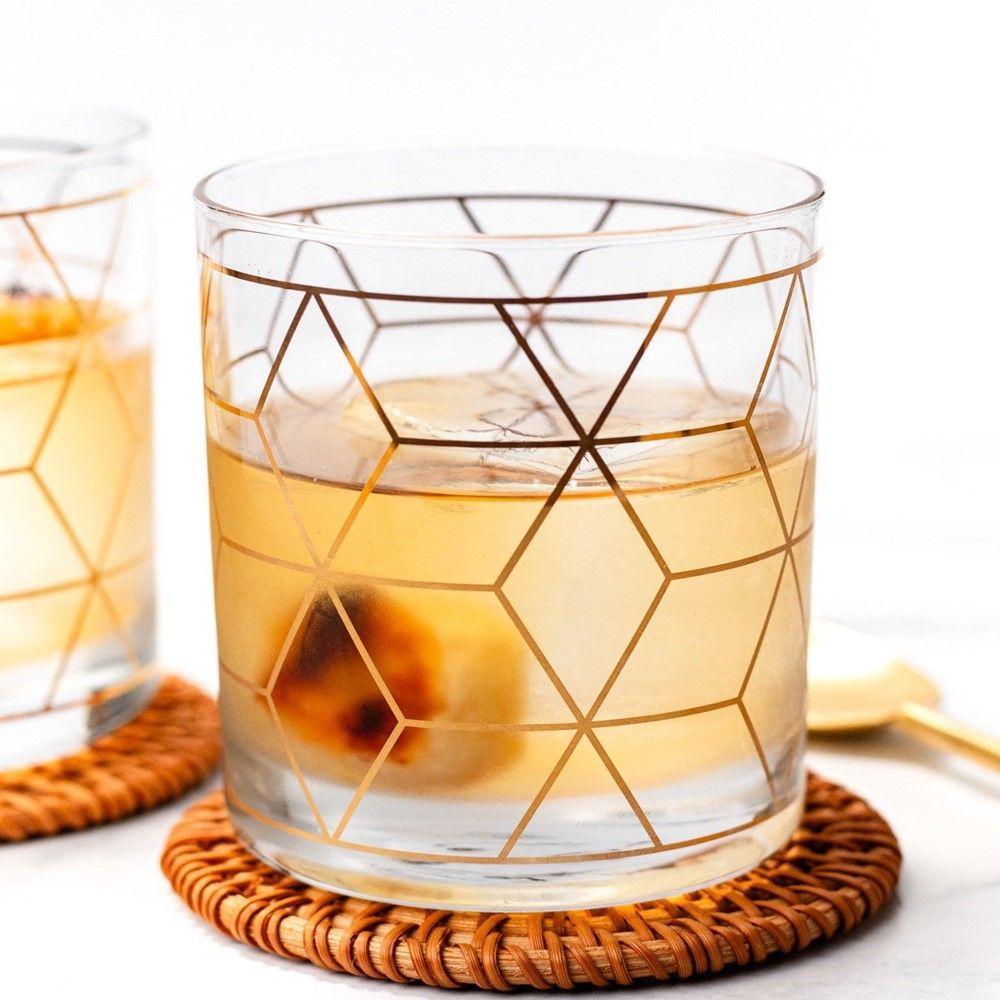 Jogo 2 Copo De Whisky Vidro Baixo Para Drink Whiskey Uisque Detalhe Dourado Cube 320ml Wolff