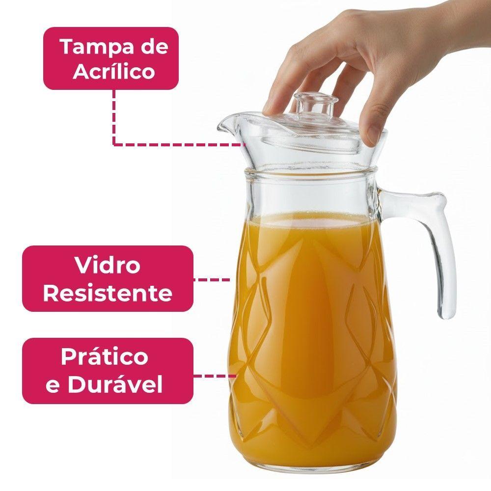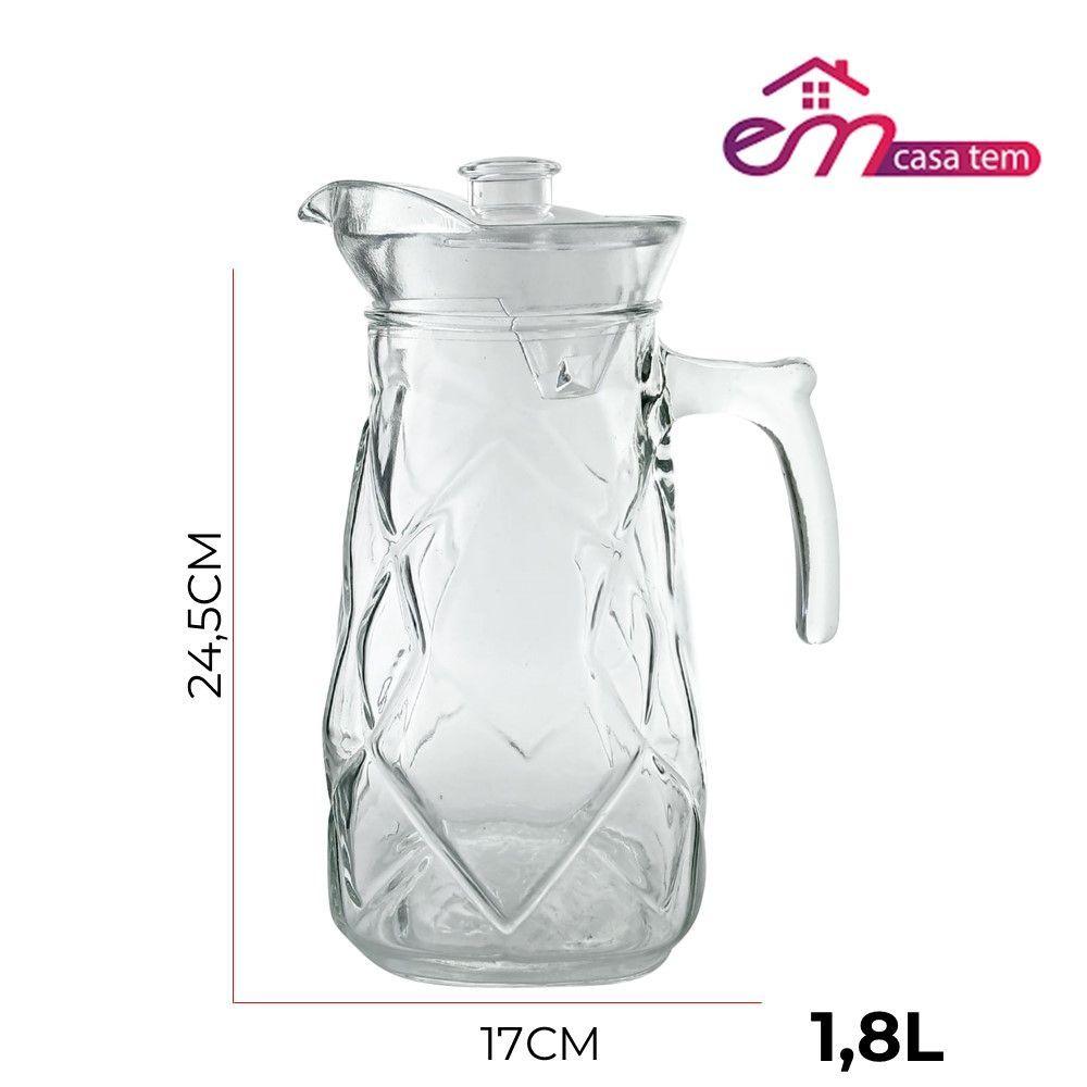 Jogo De Taças Diamante Com Jarra 5 Peças Diamond Suco água 340ml 1,8l Em Casa TemJogo de Taças Diamante com Jarra 5 Peças Diamond Suco Água 340ml 1,8L Em Casa TemO kit vem com:1 Jarra de Vidro para Suco Água com Tampa Acrílico Transparente Bruxelas 1,8L Em Casa Tem4 Taça de Vidro para Água Diamante Transparente EmCasaTem 340ml Armazena e serve bebidas como água e sucos, contribuindo para a manutenção de suas características originais. A jarra, fabricada em vidro, não absorve odores ou sabores, garantindo a pureza da bebida. Possui uma tampa de acrílico que atua como barreira contra impurezas externas, ao mesmo tempo que permite a visualização do conteúdo para identificação rápida. O formato da alça oferece uma pega segura e confortável ao servir, mesmo quando a jarra está cheia. A base é projetada para proporcionar estabilidade em superfícies planas, reduzindo o risco de tombamento. Com capacidade de 1,8 litros, a jarra é adequada para servir múltiplas porções em refeições familiares ou encontros. As quatro taças de 340ml, também em vidro de alta resistência, contribuem para a durabilidade no uso diário e não alteram o sabor das bebidas. A superfície externa das taças apresenta um padrão lapidado que auxilia na aderência durante o manuseio, reduzindo o risco de deslizamento. Cada taça possui uma base estável que minimiza a chance de tombamentos. Tanto a jarra quanto as taças são de fácil higienização, compatíveis com lavagem manual ou em máquinas de lavar louça, sem reter odores ou sabores.Conteúdo do Kit:Jarra de Vidro para Suco Água com Tampa Acrílico Transparente Bruxelas 1,8L Em Casa TemCódigo: 127929Marca: EmCasaTemMaterial: Jarra de Vidro, Tampa de AcrílicoDimensões do produto (AxLxC): 24,50x17,00x13,00cm cada unidadeQuantidade: 1 unidadeTaça de Vidro para Água Diamante Transparente EmCasaTem 340mlCódigo: 123001Marca: EmCasaTemMaterial: VidroDimensões do produto (AxLxC): 16,00x9,00x9,00cm cada unidadeQuantidade: 4 unidades