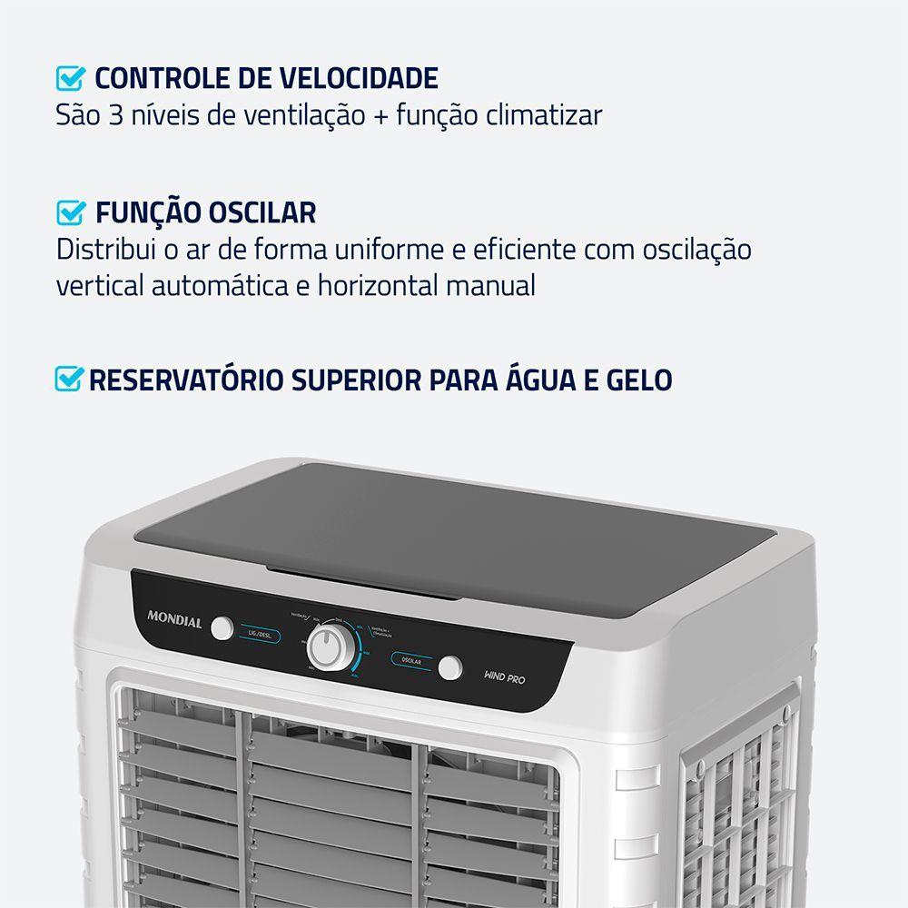 Climatizador Mondial Wind Pro 45L 230W CL-45L Branco Com Cinza 220VClimatizador Mondial Wind Pro 45L 230W CL-45L Branco/Cinza 220VMantenha sua casa sempre fresca com o Climatizador Mondial Wind Pro. Com capacidade de 45 litros, ele oferece longa autonomia e reduz a necessidade de reabastecimento constante. O climatizador Mondial reúne cinco funções em um só aparelho: filtra, ventila, circula, umidifica e climatiza o ar, promovendo bem-estar para toda a família.O sistema de oscilação vertical automática e horizontal manual permite a distribuição uniforme do ar. Com três velocidades e a função climatizar, o fluxo de ar é ajustado conforme sua preferência — de uma brisa leve a um resfriamento mais intenso.Principais Características5 em 1: filtra, ventila, circula, umidifica e climatiza o ar.Capacidade do reservatório de 45L: com indicador de nível de água, oferece maior autonomia e praticidade, reduzindo a necessidade de reabastecimentos frequentes.Potência de 230W: alto desempenho na ventilação e resfriamento, com baixo consumo de energia.Placa evaporativa tipo colmeia: aumenta a eficiência da troca térmica entre água e ar, proporcionando um ambiente mais fresco e aconchegante.Controle de velocidade: 3 níveis de ventilação + função climatizar.Reservatório superior: permite adicionar água e gelo de forma simples e rápida.Função Oscilar: distribuição uniforme do ar (vertical automática e horizontal manual).Duplo porta-fio: mais organização e praticidade.Design portátil: rodas com trava que facilitam o transporte entre cômodos.Mondial, a escolha inteligente!Especificações TécnicasMarca: MondialModelo: CL-45LCor: Branco/CinzaVoltagem: 220VDimensões e Peso AproximadosAltura: 98 cmLargura: 42 cmProfundidade: 61 cmPeso: 14 kgGarantia12 meses (3 meses de garantia legal + 9 meses contra defeitos de fabricação).ObservaçõesCertifique-se da montagem correta de todas as partes antes do uso.Uso doméstico.Confira o prazo de garantia no Manual de Instruções. Em caso de problemas, procure uma assistência técnica autorizada.É imprescindível conferir o produto no ato da entrega. Em caso de anormalidade, recuse o recebimento.Todas as informações divulgadas são de responsabilidade do fabricante, podendo sofrer alterações sem aviso prévio.Imagem meramente ilustrativa.