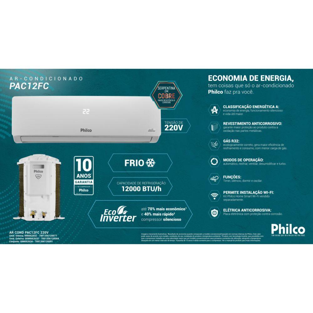Ar condicionado Split Philco Hi Wall Inverter 12.000 BTUs/h Frio PAC12FC 220VAr Condicionado Split Philco Hi Wall Inverter 12.000 BTU/h Frio PAC12FC 220VInvista em conforto, economia de energia e bem-estar com o Ar Condicionado Split Philco Inverter 12.000 BTU/h Frio PAC12FC.Principais DiferenciaisClassificação Energética A: maior economia de energia.Pintura Anticorrosiva: aletas com proteção que garantem maior durabilidade.Gás R32: mais eficiência energética e menor consumo.Filtro: lavável e de fácil substituição.Diversas Funções: Dormir, Timer, Oscilar e Turbo.Modos de Operação: Refrigera, Desumidifica, Ventila e Automático.Controle de Ventilação: baixo, médio, alto e automático.Wi-Fi: possibilidade de instalar o Kit Philco Home Smart Wi-Fi.Filtro de Proteção contra Vírus: possibilidade de instalar o Kit de proteção antiviral.Especificações TécnicasMarca: PhilcoModelo: PAC12FCCor: BrancoVoltagem: 220VCapacidade de Refrigeração: 12.000 BTU/hTipo de Tecnologia: InverterCiclo de Ar: FrioClasse Energética: ASerpentina: CobreConsumo: 493 kWh/anoFrequência: 60 HzPotência: 1080 WFase: MonofásicoNível de Ruído (Unidade Interna): 41 dBNível de Ruído (Unidade Externa): 57 dBVazão de Ar: 500 m³/hGás Refrigerante: R32Ambiente Ideal: até 20 m²Controle de Temperatura Digital: 16°C a 32°CTubulação para Conexão: 1/4” e 3/8”Dimensões e PesoEvaporadora (AxLxP): 27,0 x 79,0 x 19,5 cmPeso: 8 kgCondensadora (AxLxP): 56,0 x 47,0 x 35,5 cmPeso: 16 kgGarantiaTotal: 1 ano (3 meses de garantia legal + 9 meses para defeitos de fabricação, se instalado por empresa credenciada).ObservaçõesUso doméstico.Certifique-se da montagem correta de todas as partes antes do uso.Verifique o prazo de garantia no Manual de Instruções. Em caso de problema, procure uma assistência autorizada.Imprescindível conferir o produto no ato da entrega. Em caso de anormalidade, recuse o recebimento.Todas as informações são de responsabilidade do fabricante e podem sofrer alterações sem aviso prévio.Imagem meramente ilustrativa.