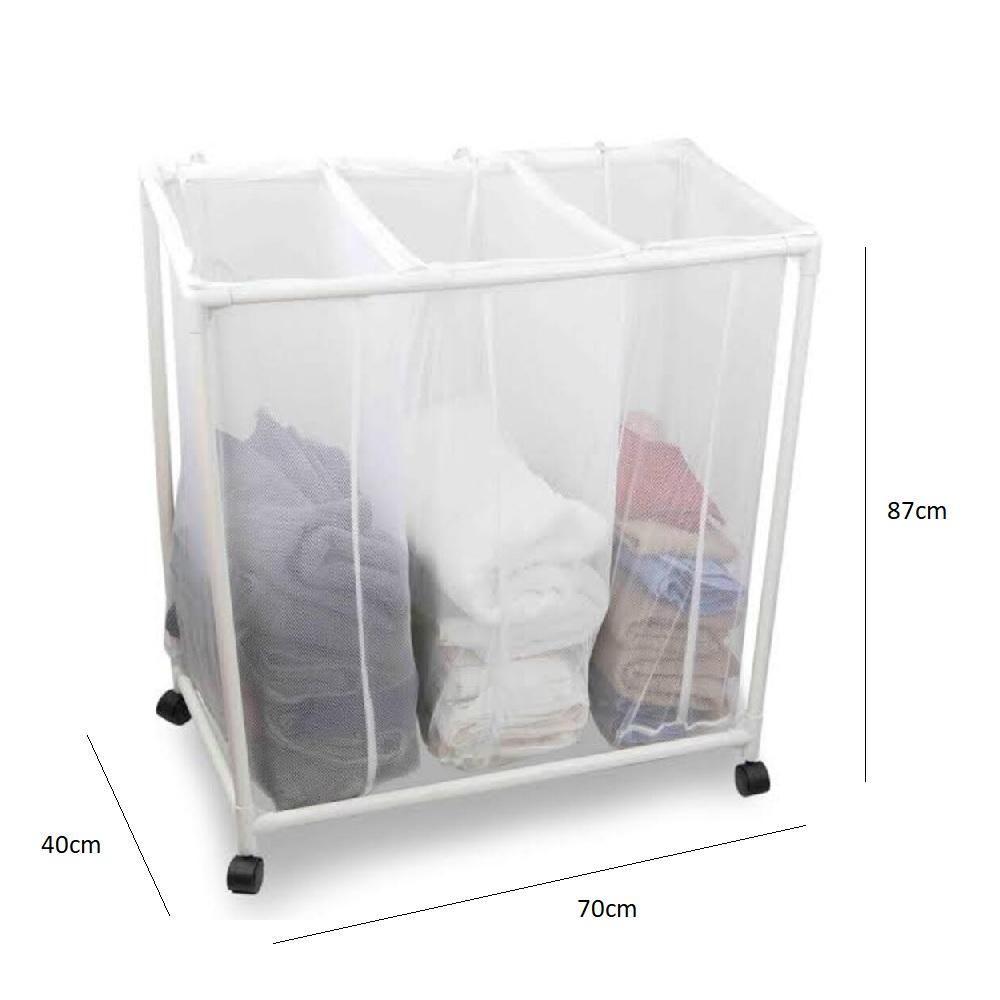 Carrinho Lavanderia Triplo Cesto De Roupas Com Rodinhas Organizador Lencol Toalha Casa Hotel Pousada Com 3 DisivoriasCarrinho de Lavanderia Triplo com Rodinhas e 3 Divisórias – Organização e PraticidadeMantenha suas roupas organizadas com o Carrinho de Lavanderia Triplo, ideal para facilitar a separação de peças e otimizar a rotina de lavagem. Com três compartimentos espaçosos, permite organizar roupas escuras, delicadas, de bebê ou conforme sua necessidade. Além disso, suas rodinhas garantem mobilidade e praticidade no transporte entre ambientes.Destaques do produto:Três divisórias espaçosas: Facilita a separação das roupas para a lavagem, tornando o processo mais eficiente.Cestos em tecido resistente: Material leve, durável e fácil de manusear.Estrutura reforçada: Confeccionado em aço para maior estabilidade e resistência.Mobilidade garantida: Rodinhas que permitem transportar o carrinho com facilidade entre os cômodos.Design moderno: Perfeito para qualquer lavanderia, combinando funcionalidade e estética.Especificações técnicas:Cor: BrancoDimensões: 87 cm (A) x 40 cm (C) x 70 cm (L)Material: Estrutura em aço e cestos em tecido leve e resistenteOtimize sua lavanderia com mais praticidade e organização. Adquira já o Carrinho de Lavanderia Triplo e facilite seu dia a dia!OBS: Vídeo meramente ilustrativoCarrinho de Lavanderia Triplo com Rodinhas e 3 Divisórias – Organização e PraticidadeMantenha suas roupas organizadas com o Carrinho de Lavanderia Triplo, ideal para facilitar a separação de peças e otimizar a rotina de lavagem. Com três compartimentos espaçosos, permite organizar roupas escuras, delicadas, de bebê ou conforme sua necessidade. Além disso, suas rodinhas garantem mobilidade e praticidade no transporte entre ambientes.Destaques do produto:Três divisórias espaçosas: Facilita a separação das roupas para a lavagem, tornando o processo mais eficiente.Cestos em tecido resistente: Material leve, durável e fácil de manusear.Estrutura reforçada: Confeccionado em aço para maior estabilidade e resistência.Mobilidade garantida: Rodinhas que permitem transportar o carrinho com facilidade entre os cômodos.Design moderno: Perfeito para qualquer lavanderia, combinando funcionalidade e estética.Especificações técnicas:Cor: BrancoDimensões: 87 cm (A) x 40 cm (C) x 70 cm (L)Material: Estrutura em aço e cestos em tecido leve e resistenteOtimize sua lavanderia com mais praticidade e organização. Adquira já o Carrinho de Lavanderia Triplo e facilite seu dia a dia! OBS: Vídeo meramente ilustrativo