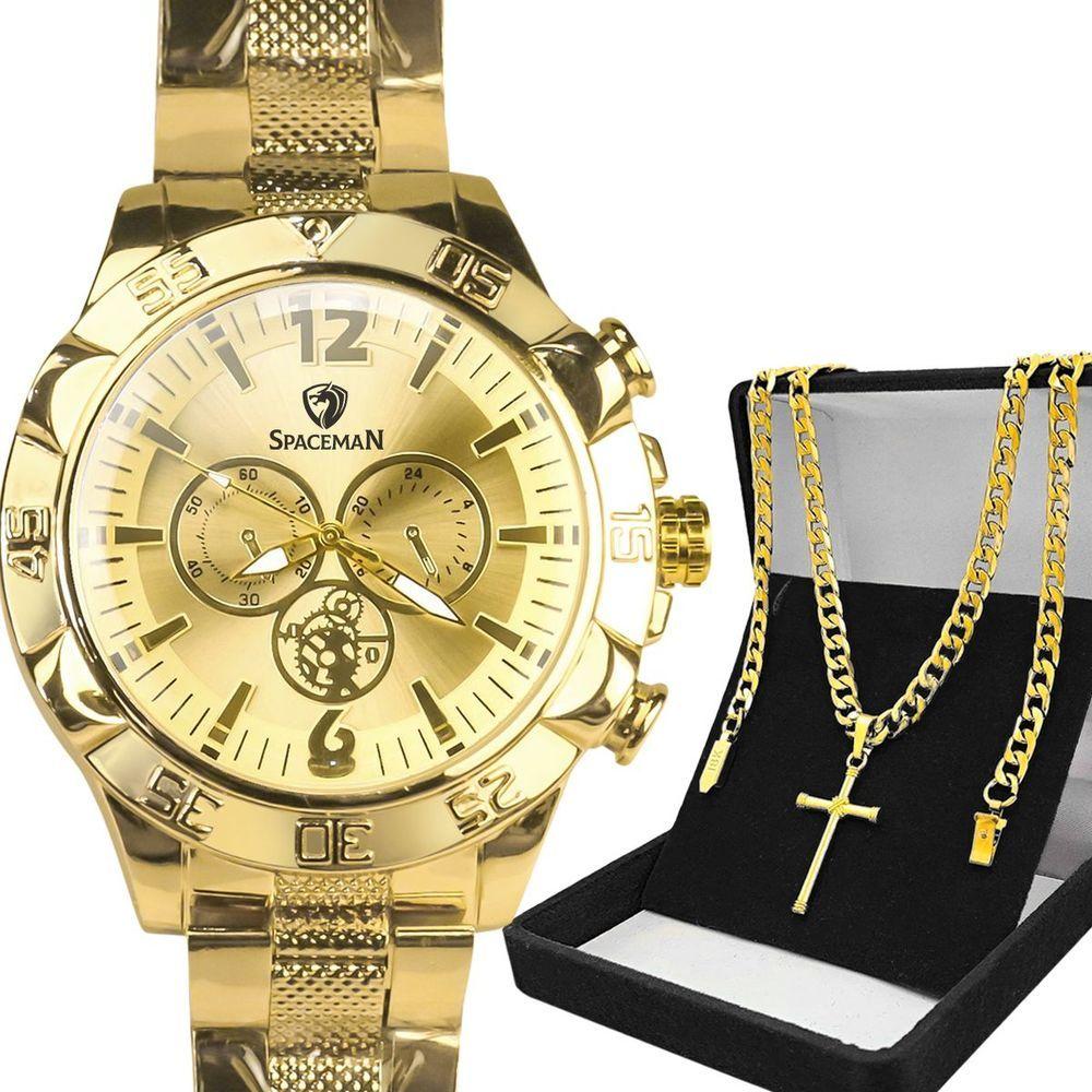 Relogio Masculino Dagua Banhado Prova Aco + Crucifixo Cordao Casual Presente Aço Inoxidavel DragaoKit Masculino Orizom Spaceman DragonDescrição do Produto:O Kit Orizom Spaceman Dragon é a escolha perfeita para homens que buscam elegância, personalidade e um visual marcante. Composto por peças de alta qualidade em aço inoxidável banhado, este conjunto exclusivo é ideal para presentear em datas especiais ou para valorizar o próprio estilo. O que acompanha o kit:- Relógio Masculino Analógico Orizom Spaceman Dragon: Fabricado em aço inoxidável com banho dourado de alto padrão, este relógio possui um design sofisticado e robusto, perfeito para uso em diversas ocasiões. Com mostrador dourado elegante e tampa traseira blindada com arte exclusiva de dragão, este relógio é à prova dágua, proporcionando segurança e durabilidade no uso diário.- Corrente Masculina Grumet: Esta corrente em aço inoxidável banhado dourado possui aproximadamente 60 cm de comprimento e um estilo robusto e elegante, que complementa o visual com requinte.- Pingente Crucifixo: Pequeno e confeccionado em aço inoxidável banhado dourado, este pingente em formato de cruz é uma peça de significado e expressão, ideal para compor um visual sofisticado e discreto. Observação: Este kit não acompanha caixa para os acessórios. As imagens com caixa são meramente ilustrativas para melhor apresentação das peças. O Kit Orizom Spaceman Dragon é a escolha certa para quem valoriza qualidade, estilo e um visual diferenciado. Ideal para presentear em ocasiões como aniversários, Dia dos Pais, Natal ou para surpreender alguém especial com um conjunto marcante e de alto padrão. Adquira já o seu Kit Masculino Orizom Spaceman Dragon e destaque-se com elegância e personalidade!