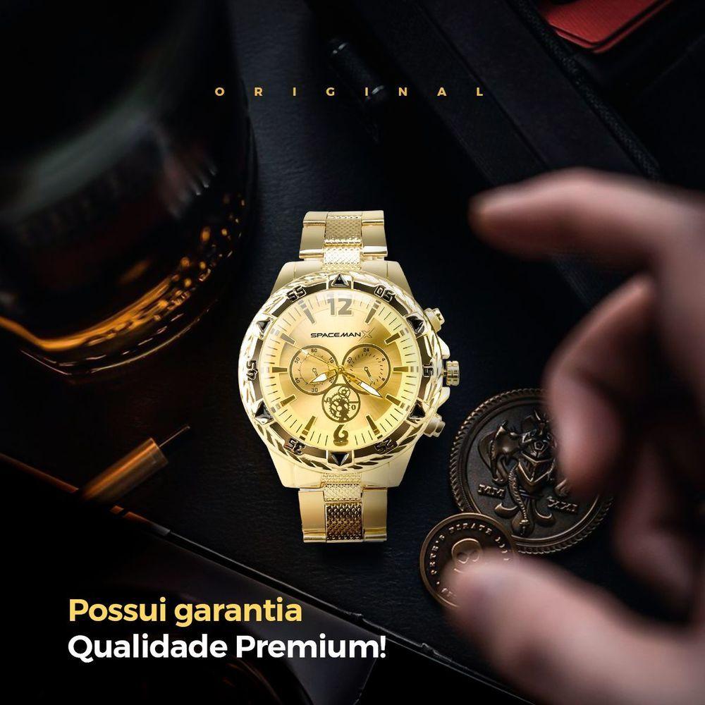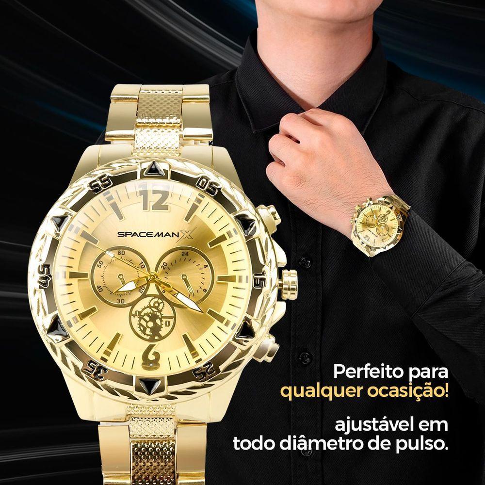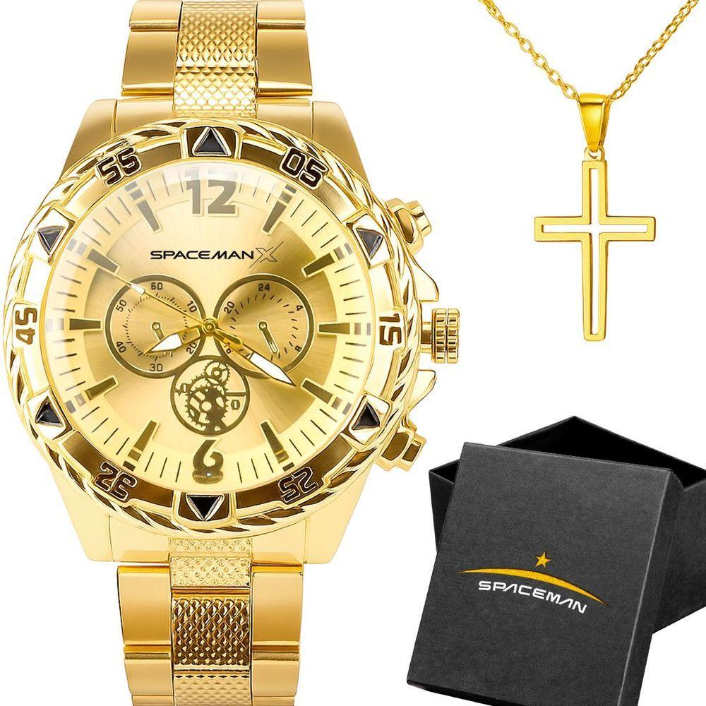 Relogio Dourado Masculino Inox Aço + Pulseira Silicone Banhado Pesado Resistente Religioso CrucifixoKit Masculino Orizom Spaceman X com Relógio, Cordão e Pingente Crucifixo - Acompanha Caixa Premium!!!Não perca a oportunidade de adquirir este exclusivo kit da linha Orizom Spaceman X, ideal para homens que valorizam estilo e presença. Com um design marcante e moderno, este conjunto completo de acessórios é perfeito para presentear em ocasiões especiais ou simplesmente surpreender alguém querido.O kit inclui:Relógio Masculino Orizom Spaceman X- Modelo analógico com estrutura em aço inoxidável banhado na cor dourada- Mostrador dourado para um visual sofisticado e uniforme- Pulseira também em aço inox banhado, com ajuste de tamanho por gomos- Produto elegante e resistente, ideal para uso cotidiano- Observação: não é à prova d'águaCordão Masculino Estilo Grumet- Modelo robusto e estiloso feito em material banhado, combinando com o acabamento do relógio- Comprimento aproximado de 68 cm, ideal para complementar o visual com presençaPingente em Formato de Crucifixo- Confeccionado em material banhado de alta qualidade, adicionando simbolismo e espiritualidade- Pode ser usado com o cordão incluso no kitCaixa Premium Orizom Spaceman- Embalagem temática e exclusiva da linha Spaceman- Ideal para acomodar o relógio e o cordão com pingente- Proporciona uma apresentação sofisticada e pronta para presenteNão perca a oportunidade de adicionar estilo, impacto e significado ao seu dia a dia com este incrível kit. Aproveite esta oferta exclusiva e destaque-se com acessórios de qualidade e identidade marcante.