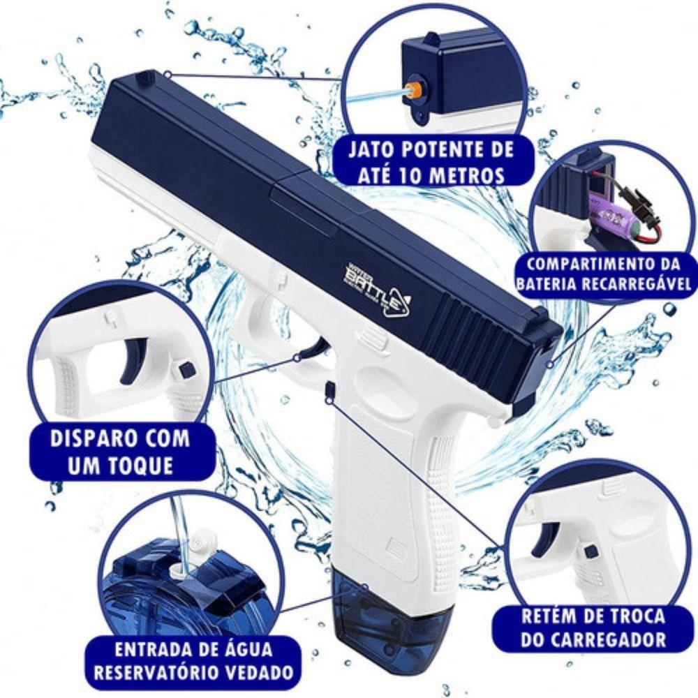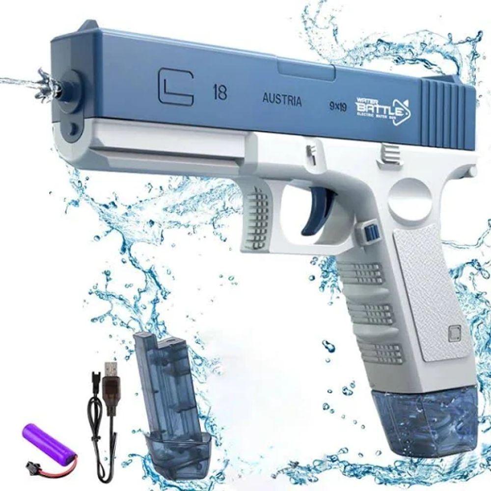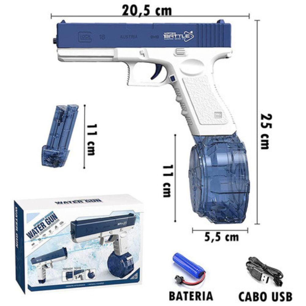 Arma água Elétrica Automática 2 Pente Carregável - AzulEletric Water GunCom a pistola Glock de água elétrica, a diversão é garantida! Design realista e de alta qualidade. O brinquedo garante diversão para todas as idades.Permita que você tenha uma emocionante batalha com de água com seu amigo ou filho. O brinquedo tem potência de motor para disparo rápido e automático, com um alcance longo de até 10m. Não importa onde seu oponente esteja, você pode facilmente encharcá-lo no campo de batalha.Possui fonte de alimentação de bateria de lítio que podem ser carregadas. Suporta carregamento USB e pode ser usada continuamente com duração de aproximadamente 1 hora. Tempo de carregamento aproximado de 1 hora e meia. Pistola feita de ABS de alta qualidade, que atende aos padrões de qualidade do brinquedo.Possui 2 carregadores (depósitos de água) de alta capacidade para deixar a brincadeira ainda mais legal.Importante: Não pode ser submerso na água – Pode causar danos aos componentes eletrônicos!Conteúdo da embalagem:1 Pistola de água elétrica2 Carregadores1 Cabo de carregamento USB1 Manual de utilização
