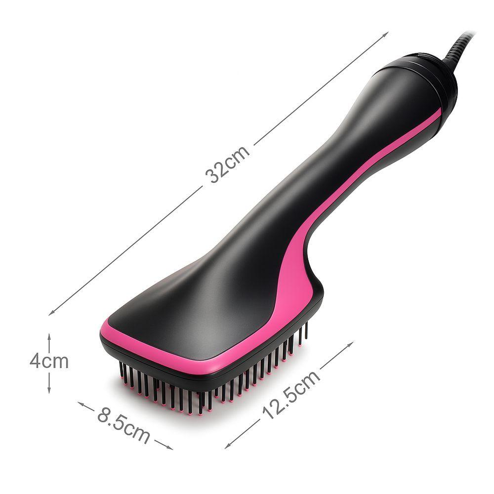 Escova Secadora De Cabelo 220V – Alisadora E ModeladoraEscova Secadora de Cabelo 220V – Alisadora e ModeladoraA escova secadora de cabelo é um equipamento 2 em 1 desenvolvido para facilitar a rotina de cuidados capilares, unindo as funções de escova e secador em um único produto. Ideal para quem busca praticidade e resultados profissionais em casa, ela permite alisar, modelar e secar os fios com eficiência.Características:Design Ergonômico: Corpo curvado com cabo anatômico, oferecendo firmeza e conforto durante o uso.Cerdas com Pontas Protetoras: Proporcionam uma escovação suave, desembaraçando os fios sem agredir o couro cabeludo.Saída de Ar Uniforme: Distribui o calor de forma equilibrada, garantindo uma secagem mais rápida e homogênea.Três Níveis de Temperatura e Velocidade: Ajustes personalizáveis para diferentes tipos de cabelo e finalizações.Cabo Giratório 360°: Facilita os movimentos sem enrolar o fio, permitindo maior liberdade durante o uso.Dimensões:Comprimento total: 32 cmLargura da base: 8,5 cmComprimento da base (cabeça da escova): 12,5 cmAltura da base: 4 cmBenefícios:Reduz o tempo de secagem e alisamento comparado ao uso de escova e secador separadosProporciona cabelos mais brilhantes e com menos frizz graças à tecnologia de íonsPode ser usada em cabelos secos, úmidos ou levemente molhadosIdeal para todos os tipos de cabelo, inclusive os mais volumososMais leve que um secador tradicional, facilitando o uso contínuoEspecificações Técnicas:Voltagem: 220VPotência: Aproximadamente 1000W (dependendo do modelo específico)Material: Plástico resistente com acabamento térmicoCor: Preta com detalhes em rosa