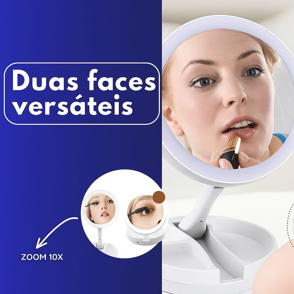 Espelho De Mesa Maquiagem C/ Luz Led Rotação 360° CamarimEspelho Led Portátil Zoom 10x Dobrável Perfeito MaquiagemEste espelho é feito para você que, mesmo na correria cotidiana, sempre arruma um tempinho para retocar a maquiagem ou arrumar o cabelo.Por ser dobrável e acompanhar em sua base um organizador de maquiagem, leve e compacto, ocupa pouco espaço, sendo ideal para guardar na bolsa, na mala de viagem e até mesmo em casa.Além de ter um design elegante, este espelho de maquiagem com dupla face é iluminado com LEDs, sendo muito prático. Basta pressionar um botão na parte inferior do suporte para ligar as luzes LED.BENEFÍCIOS:Possui LED para auxiliar em tarefas como fazer sobrancelhas, limpeza facial, etc...Duas faces, sendo uma com zoom x10 e outra com zoom x1;Funciona tanto à pilhas quanto conectado à energia elétrica;Leve e dobrável para facilitar o transporte.ESPECIFICAÇÕES:Modelo: Espelho Led Aumenta 10X Dupla FaceMaterial do Suporte: PlásticoVidro: Livre de distorçãoAlimentação: 4 pilhas AA (não inclusas)Peso do Produto: 390gDiâmetro do espelho: 13 cmEspelho Aberto: Altura: 29cm; Largura: 16cmEspelho Fechado/Dobrado: Altura: 5cm; Largura: 16cm.ITENS INCLUSOS:01 Espelho Dupla Face 10x Com Luz Led;01 Cabo USB.