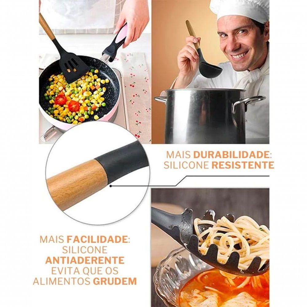 Colher De Arroz Silicone Utensílios De Cozinha Conjunto 12Apresentamos o Conjunto de Cozinha Premium de 12 Peças, uma escolha excepcional para chefs e entusiastas culinários. Com cabos de madeira ergonômicos e duráveis, este conjunto combina funcionalidade e elegância. Além disso, é livre de BPA e não tóxico e inodoro, proporcionando uma experiência culinária segura e saudável. Com sua capacidade de suportar temperaturas extremas de -40 a 230°C, esses utensílios são perfeitos para qualquer preparação. Com o furo na ponta do cabo, é fácil pendurá-los e mantê-los organizados e acompanha um lindo baldinho caso preferir deixar todos juntos. Desfrute de um conjunto versátil, resistente e estiloso, que eleva suas habilidades culinárias e adiciona um toque de sofisticação à sua cozinha.Ficha técnica:>Material: Silicone, Aço Inox e MDF>Livre de BPA>Peso aproximado na caixa: 1020kg>Peso aproximado sem caixa: 900g -------------------------------------- O que vem na caixa: 1- Colher Escumadeira 1- Espátula Sólida 1- Colher para Servir 1- Espátula Vazada 1- Colher Raspadora 1- Espátula Raspadora 1- Pegador de Macarrão 1- Concha de Sopa 1- Pincel Culinário 1- Pinça Pegador 1- Fouet Batedor 1- Baldinho Guardador