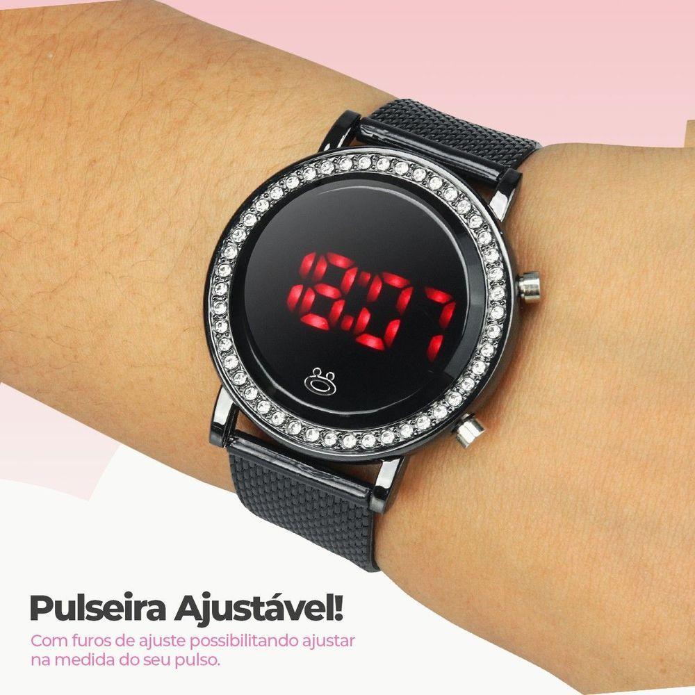 Relogio Feminino Led Aço Strass Preto Digital Casual Redondo Presente Ajustavel Social
