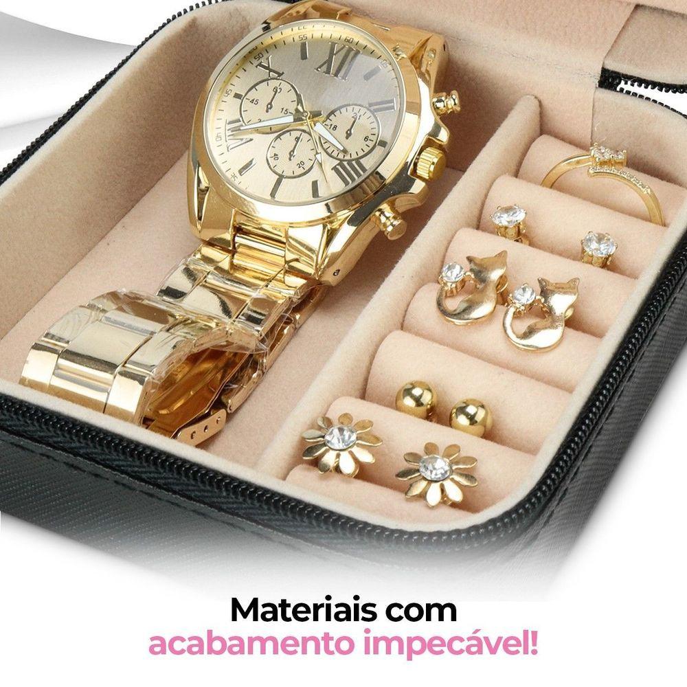 Relogio Feminino Banhado Aço + Porta Joia + Pulseira Original Qualidade Premium Social Prova DaguaKit Elegante de Acessórios Banhados a OuroGaranta um toque de luxo e sofisticação com este kit exclusivo de acessórios banhados a ouro. Este conjunto é perfeito para quem deseja adicionar um toque de glamour e elegância ao visual.O kit inclui:- 1 Relógio Analógico Feminino Banhado a Ouro Dourado: Desfrute de estilo e funcionalidade, com um relógio à prova d'água em aço inoxidável.- 1 Porta Joias/Relógio Orizom Maria Exclusivo: Mantenha seus acessórios organizados e em grande estilo com este item exclusivo.- 1 Colar Banhado a Ouro com Pedrinha de Strass: Adicione um brilho sutil e elegante ao seu visual.- 1 Pulseira Banhada com Pingente: Complemente seu look com uma pulseira charmosa e elegante.- 5 Pares de Brincos Banhados a Ouro com Diferentes Formatos: Desfrute de variedade e versatilidade com estes pares de brincos sofisticados.- 1 Anel Banhado a Ouro: Adicione um toque final de elegância ao seu conjunto de acessórios.IMPORTANTE: Todos os acessórios são enviados com desenhos e formatos variados, conforme disponibilidade em estoque. As imagens são apenas uma representação do que será enviado, podendo ou não serem idênticos às imagens.Este kit é perfeito para presentear a si mesma ou alguém especial, oferecendo uma variedade de acessórios luxuosos para diferentes ocasiões. Garanta já o seu!