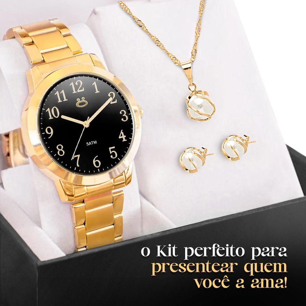 Brincos + Relogio Feminino Aço Inox Dourado + Colar + Caixa Moda Strass Qualidade Premium CasualKit Completo Orizom MariaRelógio Feminino Analógico Orizom Maria: Apresenta um design deslumbrante dourado, banhado em ouro, e todo confeccionado em aço inoxidável de alta qualidade. Seu visor preto confere um toque de mistério e sofisticação. Um acessório premium que complementará qualquer look com glamour e estilo. Acessórios Banhados: O conjunto inclui um colar banhado em ouro, um pingente em forma de coração feito em strass transparente, e um par de brincos também em forma de coração com strass transparente. Adicionam um toque de charme, elegância e brilho ao visual. Caixa Ultra Premium: Uma caixa exclusiva, projetada para guardar o relógio e os acessórios com segurança e estilo. O toque final para este conjunto luxuoso. Surpreenda aquela mulher especial em sua vida com um presente que transborda elegância, qualidade e cuidado. Este conjunto é a escolha perfeita para aniversários, datas comemorativas ou simplesmente para demonstrar seu amor e apreço.Adquira agora o Kit Completo Orizom Maria e faça da sua Maria o centro das atenções com este conjunto deslumbrante. A beleza e a sofisticação estão ao seu alcance!