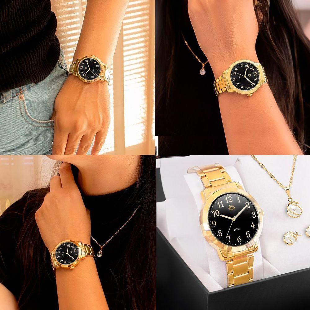 Brincos + Relogio Feminino Aço Inox Dourado + Colar + Caixa Moda Strass Qualidade Premium Casual