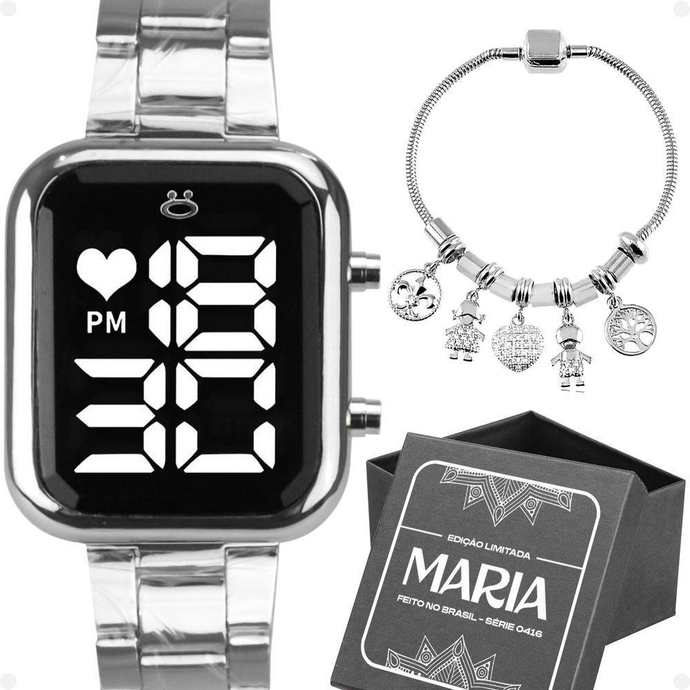 Relogio Feminino Aço Inox Prata + Caixa + Pulseira Pandora Qualidade Premium Presente Original ModaKit de Presente Orizom Maria - Relógio Feminino Digital Quadrado + Pulseira em Aço InoxidávelSurpreenda no Dia dos Namorados com o Kit de Presente Orizom Maria! Este kit inclui um Relógio Feminino Digital com design quadrado, em cor prata e feito de aço inoxidável, com tampa blindada e arte exclusiva Maria. Acompanha uma Pulseira estilo delicada, também em aço inoxidável na cor prata, com aproximadamente 21 cm de comprimento. Além disso, a caixa premium temática Maria gravado é ideal para guardar o relógio e acessórios, tornando-o perfeito para presentear a pessoa amada. Demonstre amor e carinho com este kit exclusivo da Orizom!