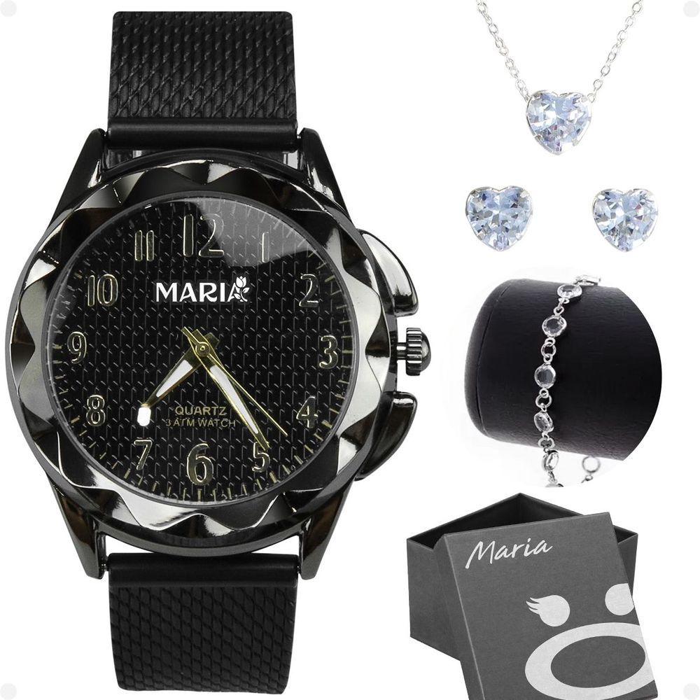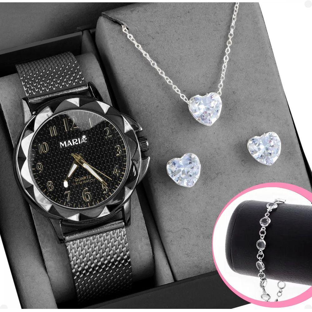 Relogio Feminino Aço Prova Dagua + Colar Brinco + Caixa Moda Zirconia Ajustavel Qualidade PremiumKit Orizom Maria - Relógio Analógico Feminino + Colar + Brincos + Pulseira + Caixa Premium- Relógio Analógico Feminino Orizom Maria:Marca: OrizomModelo: MariaGênero: FemininoQualidade: Ultra premiumProva d'água: SimMaquinário: Todo feito em aço inoxidável, preto (black piano)Mostrador: Preto, com números fáceis para compreensão das horasTampa: Blindada com todos os detalhes de autenticidade, incluindo arte em forma de flores contornando o logo da OrizomPulseira: Ajustável em silicone, servindo em qualquer pulso- Colar de Prata:Material: Aço inoxidávelComprimento: Aproximadamente 45 cmPingente: Pedrinha de strass transparente- Par de Brincos:Estilo: Mesmo estilo do pingente- Pulseira de Prata:Material: Aço inoxidávelComprimento: Aproximadamente 21 cm- Caixa Premium Orizom Maria:Marca: OrizomModelo: MariaFunção: Acomoda tanto o relógio quanto os acessóriosSurpreenda com este conjunto elegante e sofisticado, ideal para presentear a Maria da sua vida ou para se presentear. Aproveite a oportunidade de adquirir este exclusivo kit da Orizom Maria, combinando estilo e qualidade em um só lugar.